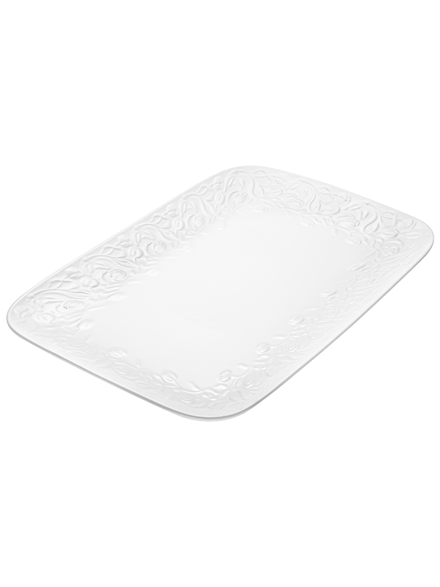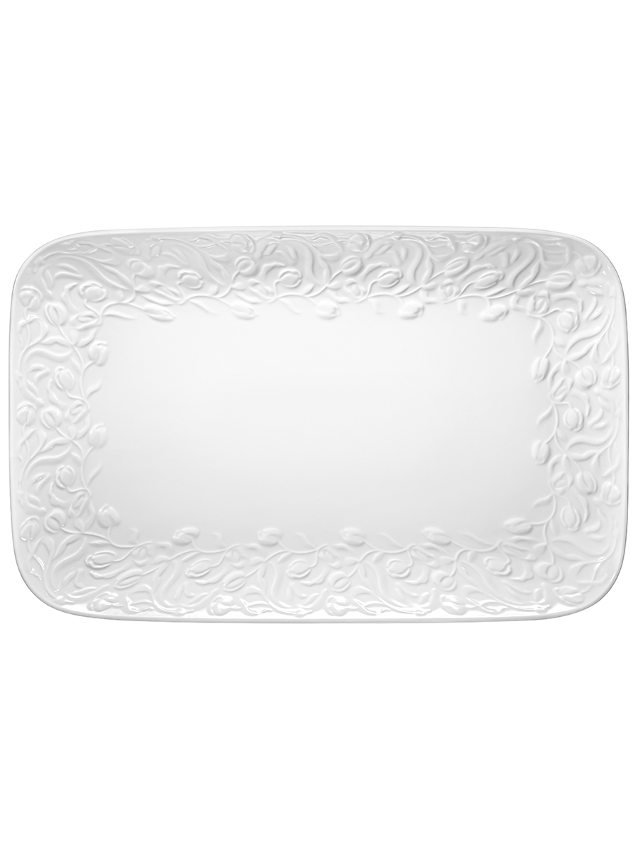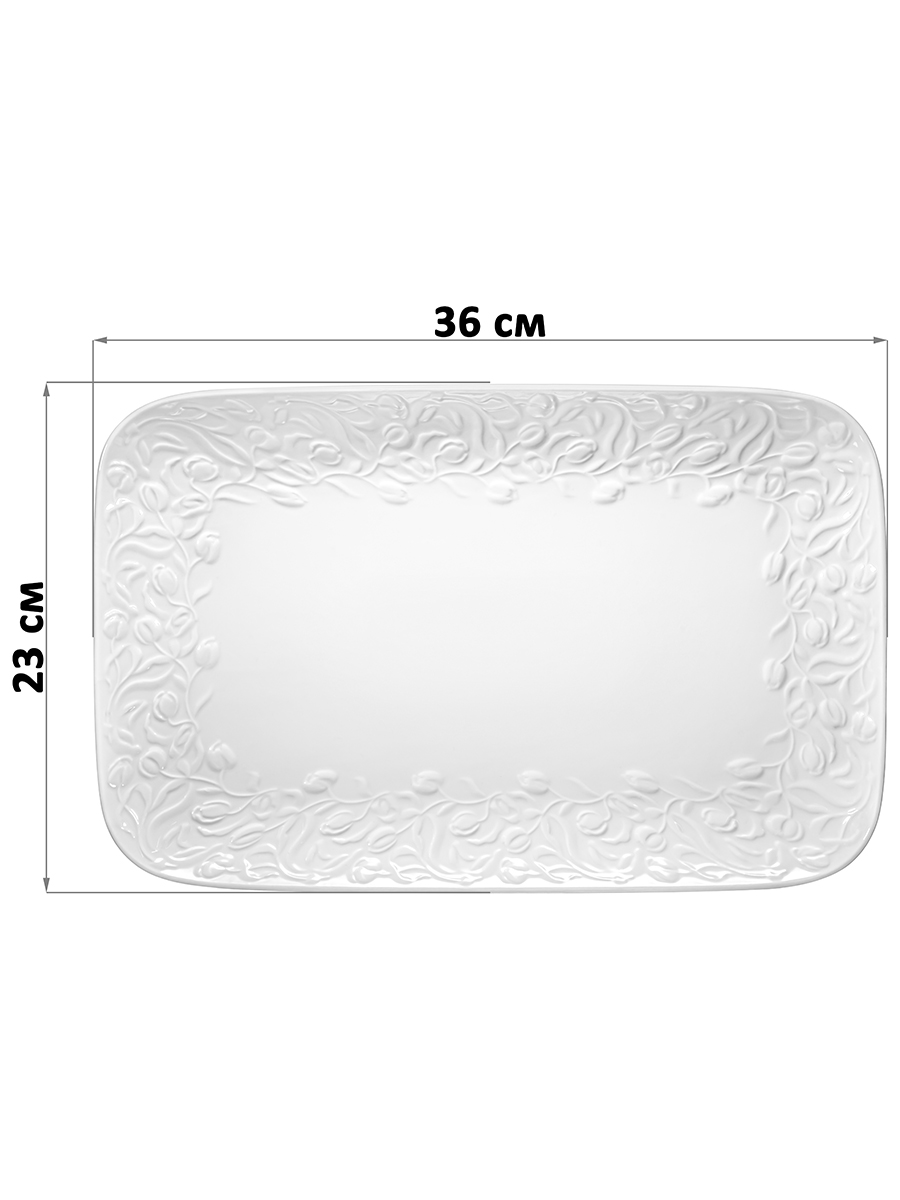 Прямоугольное блюдо Elan Gallery "Тюльпаны" размером 36х23х3 см выполнено из белого фарфора в классическом дизайне. Подойдет для подачи рыбных или мясных блюд. Можно использовать для сервировки нарезки, овощей или фруктов для угощения большого количества гостей. Посуда серии украшена рельефным узором с цветами. Эргономичная форма тарелки позволит использовать её как поднос. Удобно разместить на сервировочном блюде торт, пироги и другие сладости для угощения большого количества гостей. Фарфоровая посуда отличается от керамической повышенной плотностью. Фарфор не впитывает цвет продуктов и не деформируется от влаги, чему может быть подвержена керамика. Не рекомендуется применять абразивные моющие средства. Можно использовать в микроволновой печи и мыть в посудомоечной машине. Станет отличным подарком для ценителей стильной сервировки. Поставляется в картонной коробке. Благодаря коробочке с логотипом бренда не понадобится дополнительная подарочная упаковка. Особенно понравится любителям посуды в скандинавском стиле. Серия "Тюльпаны" позволит собрать сервиз в едином стиле и станет украшением вашего дома!
