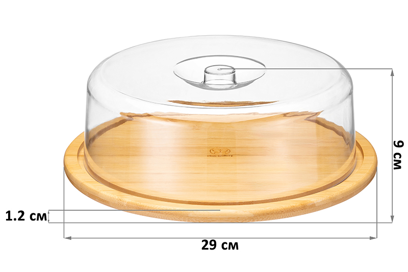 Сервировочное блюдо с прозрачной крышкой от бренда Elan Gallery предназначено для эстетичной подачи выпечки, десертов и закусок. Круглое блюдо выполнено из бамбука, прозрачная крышка – из пластика. Размер бамбуковой подставки вместе с пластиковой крышкой – 29х29х9 см. Размер блюда без крышки – 29х29х1,2 см, внутренний диаметр блюда – 24,5 см. Размер крышки 25,5х25,5х8,5 см, её внутренний диаметр – 25 см. Используйте контейнер для сервировки самых разнообразных угощений, например, сырной и мясной нарезки. Благодаря вместительной ёмкости получится разместить много различных видов сыра, а также украсить сырную тарелку кусочками овощей и фруктов. Пластиковый купол защитит продукты от заветривания при длительном нахождении на столе. Эстетично подайте к столу пирожные, пироги, печенье и любые сладости. Благодаря прозрачной крышке на тарелочке будут отлично смотреться торт с красочной глазурью, аппетитные пончики и другие кондитерские изделия. Круглую бамбуковую подложку можно отдельно использовать в роли декоративного подноса на вашей кухне. На пикнике тортовница подойдёт для сервировки кусочков хлеба, бутербродов и канапе. Крышечка защитит от пыли, насекомых и различных внешних факторов. Не рекомендуется применять абразивные моющие средства. Нельзя использовать в микроволновой печи. Без бамбукового блюда крышку можно мыть в посудомоечной машине. Бамбук нельзя замачивать. Тортница станет полезным подарком на любой праздник и всегда пригодится в быту. В коллекции бренда Elan Gallery вы найдёте большой выбор товаров для дома и дачи. Здесь представлено много стильной посуды и кухонного инвентаря – каждый обязательно подберёт вариант на свой вкус. Наполните пространство вокруг себя уютом и эстетикой!