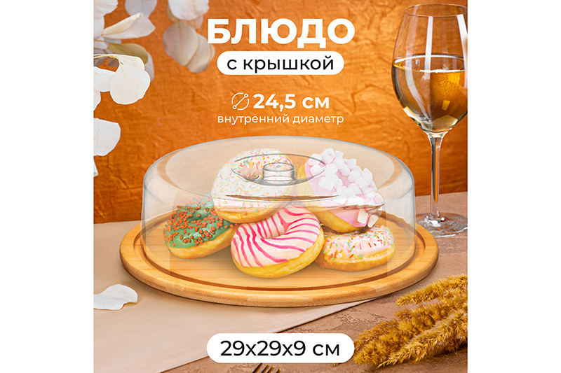 Сервировочное блюдо с прозрачной крышкой от бренда Elan Gallery предназначено для эстетичной подачи выпечки, десертов и закусок. Круглое блюдо выполнено из бамбука, прозрачная крышка – из пластика. Размер бамбуковой подставки вместе с пластиковой крышкой – 29х29х9 см. Размер блюда без крышки – 29х29х1,2 см, внутренний диаметр блюда – 24,5 см. Размер крышки 25,5х25,5х8,5 см, её внутренний диаметр – 25 см. Используйте контейнер для сервировки самых разнообразных угощений, например, сырной и мясной нарезки. Благодаря вместительной ёмкости получится разместить много различных видов сыра, а также украсить сырную тарелку кусочками овощей и фруктов. Пластиковый купол защитит продукты от заветривания при длительном нахождении на столе. Эстетично подайте к столу пирожные, пироги, печенье и любые сладости. Благодаря прозрачной крышке на тарелочке будут отлично смотреться торт с красочной глазурью, аппетитные пончики и другие кондитерские изделия. Круглую бамбуковую подложку можно отдельно использовать в роли декоративного подноса на вашей кухне. На пикнике тортовница подойдёт для сервировки кусочков хлеба, бутербродов и канапе. Крышечка защитит от пыли, насекомых и различных внешних факторов. Не рекомендуется применять абразивные моющие средства. Нельзя использовать в микроволновой печи. Без бамбукового блюда крышку можно мыть в посудомоечной машине. Бамбук нельзя замачивать. Тортница станет полезным подарком на любой праздник и всегда пригодится в быту. В коллекции бренда Elan Gallery вы найдёте большой выбор товаров для дома и дачи. Здесь представлено много стильной посуды и кухонного инвентаря – каждый обязательно подберёт вариант на свой вкус. Наполните пространство вокруг себя уютом и эстетикой!