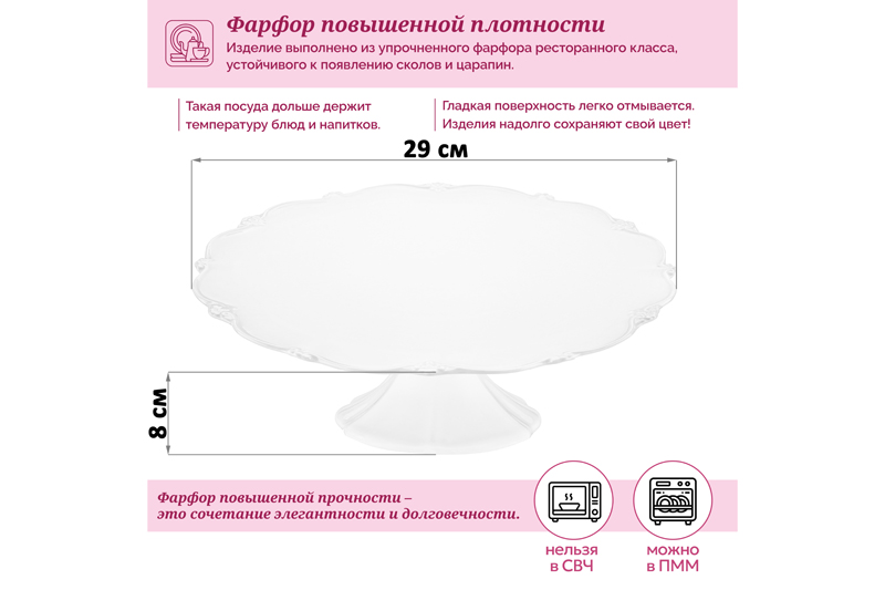 Тортовница на ножке из серии "Галант" предназначена для красивой подачи разнообразных кондитерских изделий. Размер – 29х29х8 см. Выполнена из высококачественного белого фарфора и украшена ажурной каймой. Фарфор не впитывает цвет продуктов и надолго сохранит свою нежную белизну. Изделие дополнит любой интерьер и привнесёт в ваш дом атмосферу французской утончённости. Используйте блюдо для подачи тортов, пряников, блинов и другой выпечки. Она также подойдёт для конфет, фруктов, пряников, мармелада, зефира и прочих сладостей. Благодаря вместительности и функциональности сервировочного блюда вы сможете предложить к столу множество разнообразных вариантов подачи бутербродов, канапе, суши, роллов, сыра и других закусок на празднике или вечеринке. Порадуйте себя и гостей изысканной сервировкой. Не рекомендуется применять абразивные моющие средства. Подойдёт для использования в посудомоечной машине и микроволновой печи. Поставляется в красивой картонной коробке – благодаря ей вам не потребуется дополнительная подарочная упаковка. Это идеальный подарок для хозяйки, ценящей не только практичность, но и стиль. Фарфоровая коллекция "Галант" позволит создать сервировку, как в лучших домах Парижа!