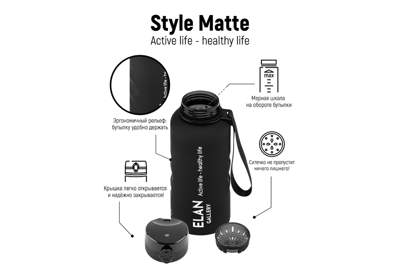 Бутылка для воды и другой жидкости Elan Gallery "Style Matte" чёрного цвета имеет углубления для пальцев и мерную шкалу. Следите за водным балансом и ведите здоровый и активный образ жизни! Объём ёмкости – 1,5 литра. Питьевая бутылочка выполнена из качественного пластика Usa Tritan. Не содержит бисфенол А и полностью безопасна для здоровья. Подходит для холодных и горячих напитков: воды, сока или чая. Бутыль для питья оснащена ситечком, поильником и клапаном (замком) на крышке. Дорожная бутылка имеет защиту от случайного открывания в сумке или рюкзаке. Имеет ремешок для переноски, что удобно для прогулки или бега. Стильный инвентарь станет незаменимой вещью на отдыхе, в путешествиях или спортзале. Бутылку на ремне с матовым покрытием удобно использовать во время поездок на велосипеде, в автомобиле или во время игры в футбол. Фляга для воды Style matte многоразовая, прочная и легкая, её удобно брать в дорогу или тренажёрный зал. Можно использовать как спорт бутылку для фитнеса и велоспорта, туризма, а также как детскую для школьника на занятиях физкультурой. Не впитывает запахи, не влияет на вкус напитков и легко отмывается. Красивая пластиковая бутылка поможет утолить жажду охлаждённым лимонадом на прогулке, тренировке или в школе. Не подходит для СВЧ, ПММ, стерилизатора. Станет приятным подарком мужчинам и женщинам. Такой сюрприз особенно придётся по вкусу спортсменам: футболисту или любительнице гимнастики и танцев. Станет прекрасным дополнением вашей коллекции походного и туристического инвентаря. В коллекции Elan Gallery представлено много посуды и товаров для дома на любой вкус. Спортивные аксессуары серии Style matte помогут следить за водным балансом и пить любимые напитки, где бы вы ни находились!
