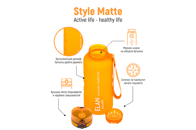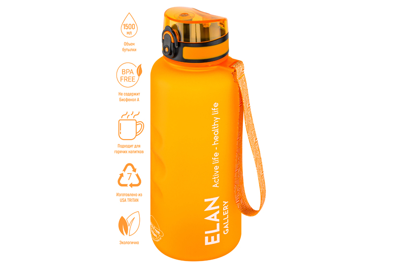 Бутылка для воды и другой жидкости Elan Gallery "Style Matte" оранжевого цвета имеет углубления для пальцев и мерную шкалу. Следите за водным балансом и ведите здоровый и активный образ жизни! Объём ёмкости – 1,5 литра. Питьевая бутылочка выполнена из качественного пластика Usa Tritan. Не содержит бисфенол А и полностью безопасна для здоровья. Подходит для холодных и горячих напитков: воды, сока или чая. Бутыль для питья оснащена ситечком, поильником и клапаном (замком) на крышке. Дорожная бутылка имеет защиту от случайного открывания в сумке или рюкзаке. Имеет ремешок для переноски, что удобно для прогулки или бега. Стильный инвентарь станет незаменимой вещью на отдыхе, в путешествиях или спортзале. Бутылку на ремне с матовым покрытием удобно использовать во время поездок на велосипеде, в автомобиле или во время игры в футбол. Фляга для воды Style matte многоразовая, прочная и легкая, её удобно брать в дорогу или тренажёрный зал. Можно использовать как спорт бутылку для фитнеса и велоспорта, туризма, а также как детскую для школьника на занятиях физкультурой. Не впитывает запахи, не влияет на вкус напитков и легко отмывается. Красивая пластиковая бутылка поможет утолить жажду охлаждённым лимонадом на прогулке, тренировке или в школе. Не подходит для СВЧ, ПММ, стерилизатора. Станет приятным подарком мужчинам и женщинам. Такой сюрприз особенно придётся по вкусу спортсменам: футболисту или любительнице гимнастики и танцев. Станет прекрасным дополнением вашей коллекции походного и туристического инвентаря. В коллекции Elan Gallery представлено много посуды и товаров для дома на любой вкус. Спортивные аксессуары серии Style matte помогут следить за водным балансом и пить любимые напитки, где бы вы ни находились!