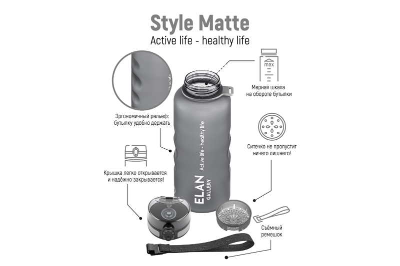 Бутылка для воды «Style Matte» от Elan Gallery – это практичное и стильное решение для ценителей активного образа жизни. Размер ёмкости – 10х10х28,5 см. Высота до крышки – 24 см. Объём – 1,5 литра. Изделие выполнено из тритана – прочного, безопасного материала, не содержащего бисфенол А. Этот пластик не впитывает запахи и не влияет на вкус напитков. Бутылочка подходит как для холодной, так и для горячей жидкости. Освежитесь любимыми летними напитками в жару или согрейтесь ароматным чаем зимой! Матовое покрытие и углубления для пальцев обеспечивают комфортное использование на прогулке, в офисе и на тренировке в зале. Надёжная крышка с герметичным клапаном препятствует проливанию, а встроенное ситечко позволит заваривать напитки с травами и фруктами. С удобным ремешком бутылку можно закрепить на рюкзаке или запястье – это позволяет брать её в путешествия, поездку на велосипеде или автомобиле. Многоразовая дорожная бутылка подходит как для туризма, так и для пикника на природе. Удобная форма делает её не только туристическим, но и спортивным инвентарём. Большая пластиковая ёмкость для питья – прекрасный вариант для занятий фитнесом, йогой или бегом в спортзале или на свежем воздухе. Она также дополнит занятия велоспортом в качестве велосипедного аксессуара. Это надёжный помощник спортсменам во время игры в футбол или волейбол, занятий гимнастикой и танцами. Подходит как для взрослых, так и для школьников – её можно взять в школу и на занятия физкультурой. Благодаря универсальному дизайну и серому цвету она подойдёт как девочкам, так и мальчикам в качестве школьного аксессуара. Функциональная бутылка в дизайнерской картонной упаковке – это готовый подарок для женщин и мужчин. Не подходит для микроволновой печи, посудомоечной машины и стерилизатора. В коллекции бренда Элан Галерея представлена разнообразная посуда и товары для дома на любой вкус. Спортивные аксессуары из серии «Style Matte» помогут следить за водным балансом, где бы вы ни находились!