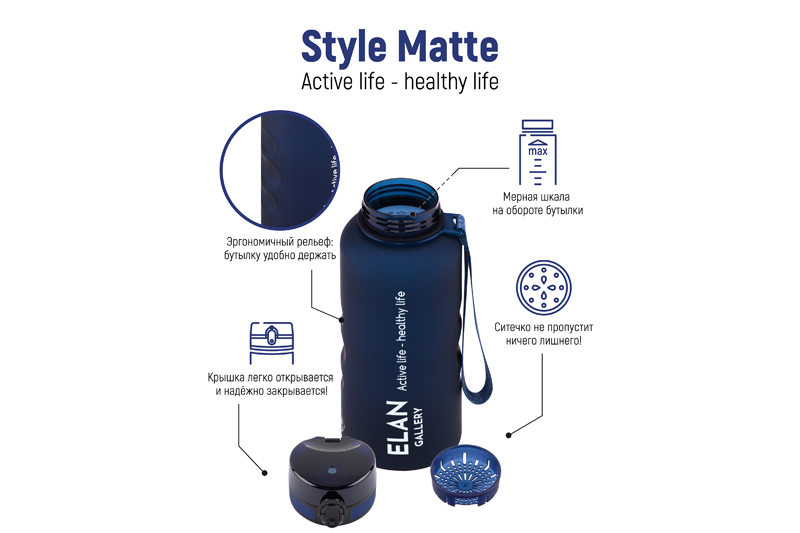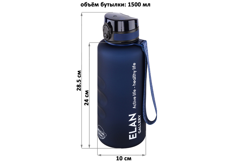 Бутылка для воды и другой жидкости Elan Gallery "Style Matte" синего цвета имеет углубления для пальцев и мерную шкалу. Следите за водным балансом и ведите здоровый и активный образ жизни! Объём ёмкости – 1,5 литра. Питьевая бутылочка выполнена из качественного пластика Usa Tritan. Не содержит бисфенол А и полностью безопасна для здоровья. Подходит для холодных и горячих напитков: воды, сока или чая. Бутыль для питья оснащена ситечком, поильником и клапаном (замком) на крышке. Дорожная бутылка имеет защиту от случайного открывания в сумке или рюкзаке. Имеет ремешок для переноски, что удобно для прогулки или бега. Стильный инвентарь станет незаменимой вещью на отдыхе, в путешествиях или спортзале. Бутылку на ремне с матовым покрытием удобно использовать во время поездок на велосипеде, в автомобиле или во время игры в футбол. Фляга для воды Style matte многоразовая, прочная и легкая, её удобно брать в дорогу или тренажёрный зал. Можно использовать как спорт бутылку для фитнеса и велоспорта, туризма, а также как детскую для школьника на занятиях физкультурой. Не впитывает запахи, не влияет на вкус напитков и легко отмывается. Красивая пластиковая бутылка поможет утолить жажду охлаждённым лимонадом на прогулке, тренировке или в школе. Не подходит для СВЧ, ПММ, стерилизатора. Станет приятным подарком мужчинам и женщинам. Такой сюрприз особенно придётся по вкусу спортсменам: футболисту или любительнице гимнастики и танцев. Станет прекрасным дополнением вашей коллекции походного и туристического инвентаря. В коллекции Elan Gallery представлено много посуды и товаров для дома на любой вкус. Спортивные аксессуары серии Style matte помогут следить за водным балансом и пить любимые напитки, где бы вы ни находились!