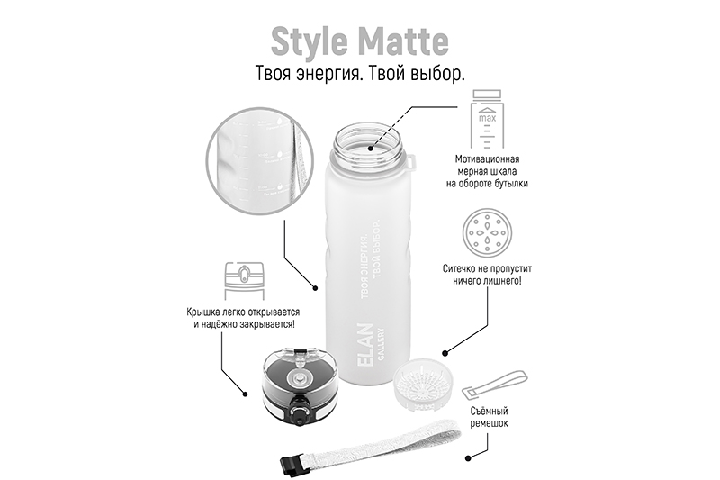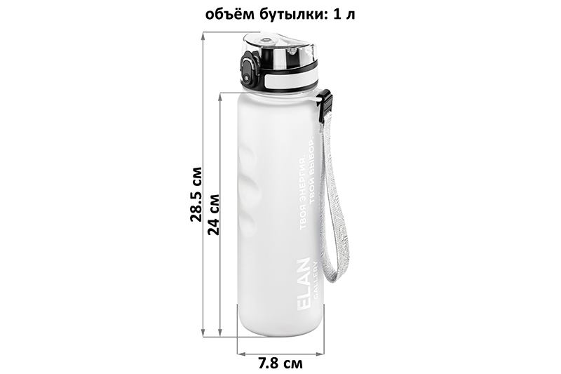 Бутылка для воды «Style Matte» от Elan Gallery – это практичное и стильное решение для ценителей активного образа жизни. Размер ёмкости – 7,8х7,8х28,5 см. Высота до крышки – 24 см. Объём – 1 литр. Изделие выполнено из тритана – прочного, безопасного материала, не содержащего бисфенол А. Этот пластик не впитывает запахи и не влияет на вкус напитков. Бутылочка подходит как для холодной, так и для горячей жидкости. Освежитесь любимыми летними напитками в жару или согрейтесь ароматным чаем зимой! Матовое покрытие и углубления для пальцев обеспечивают комфортное использование на прогулке, в офисе и на тренировке в зале. Надёжная крышка с герметичным клапаном препятствует проливанию, а встроенное ситечко позволит заваривать напитки с травами и фруктами. С удобным ремешком бутылку можно закрепить на рюкзаке – это позволяет брать её в путешествия, поездку на велосипеде или автомобиле. Многоразовая дорожная бутылка подходит как для туризма, так и для пикника на природе. Удобная форма делает её не только туристическим, но и спортивным инвентарём. Большая пластиковая ёмкость для питья с мотивационной шкалой – прекрасный вариант для занятий фитнесом, йогой или бегом в спортзале или на свежем воздухе. Она также дополнит занятия велоспортом в качестве велосипедного аксессуара. Это надёжный помощник спортсменам во время игры в футбол или волейбол, занятий гимнастикой и танцами. Подходит как для взрослых, так и для школьников – её можно взять в школу и на занятия физкультурой. Благодаря универсальному дизайну и белому цвету она подойдёт как девочкам, так и мальчикам. Функциональная бутылка в дизайнерской картонной упаковке – это готовый подарок для женщин и мужчин. Не подходит для микроволновой печи, посудомоечной машины и стерилизатора. В коллекции бренда Элан Галерея представлена разнообразная посуда и товары для дома на любой вкус. Спортивные аксессуары из серии «Style Matte» помогут следить за водным балансом, где бы вы ни находились!