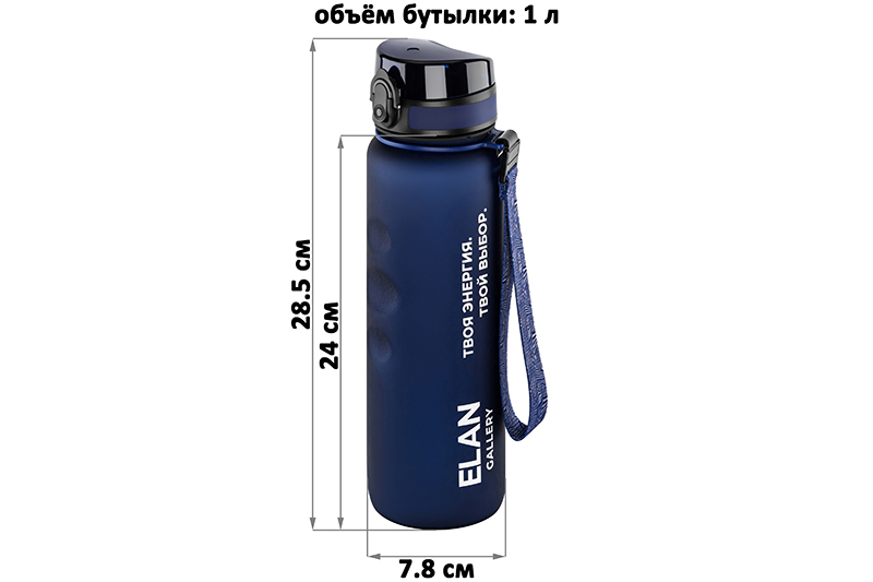 Бутылка для воды «Style Matte» от Elan Gallery – это практичное и стильное решение для ценителей активного образа жизни. Размер ёмкости – 7,8х7,8х28,5 см. Высота до крышки – 24 см. Объём – 1 литр. Изделие выполнено из тритана – прочного, безопасного материала, не содержащего бисфенол А. Этот пластик не впитывает запахи и не влияет на вкус напитков. Бутылочка подходит как для холодной, так и для горячей жидкости. Освежитесь любимыми летними напитками в жару или согрейтесь ароматным чаем зимой! Матовое покрытие и углубления для пальцев обеспечивают комфортное использование на прогулке, в офисе и на тренировке в зале. Надёжная крышка с герметичным клапаном препятствует проливанию, а встроенное ситечко позволит заваривать напитки с травами и фруктами. С удобным ремешком бутылку можно закрепить на рюкзаке – это позволяет брать её в путешествия, поездку на велосипеде или автомобиле. Многоразовая дорожная бутылка подходит как для туризма, так и для пикника на природе. Удобная форма делает её не только туристическим, но и спортивным инвентарём. Большая пластиковая ёмкость для питья с мотивационной шкалой – прекрасный вариант для занятий фитнесом, йогой или бегом в спортзале или на свежем воздухе. Она также дополнит занятия велоспортом в качестве велосипедного аксессуара. Это надёжный помощник спортсменам во время игры в футбол или волейбол, занятий гимнастикой и танцами. Подходит как для взрослых, так и для школьников – её можно взять в школу и на занятия физкультурой. Благодаря универсальному дизайну и тёмно-синему цвету она подойдёт как девочкам, так и мальчикам. Функциональная бутылка в дизайнерской картонной упаковке – это готовый подарок для женщин и мужчин. Не подходит для микроволновой печи, посудомоечной машины и стерилизатора. В коллекции бренда Элан Галерея представлена разнообразная посуда и товары для дома на любой вкус. Спортивные аксессуары из серии «Style Matte» помогут следить за водным балансом, где бы вы ни находились!