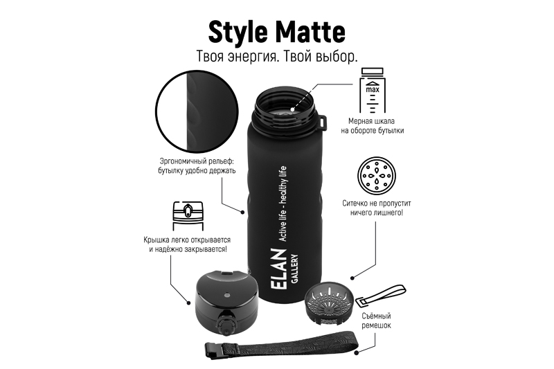 Бутылка для воды «Style Matte» от Elan Gallery – это практичное и стильное решение для ценителей активного образа жизни. Размер ёмкости – 7,8х7,8х28,5 см. Высота до крышки – 24 см. Объём – 1 литр. Изделие выполнено из тритана – прочного, безопасного материала, не содержащего бисфенол А. Этот пластик не впитывает запахи и не влияет на вкус напитков. Бутылочка подходит как для холодной, так и для горячей жидкости. Освежитесь любимыми летними напитками в жару или согрейтесь ароматным чаем зимой! Матовое покрытие и углубления для пальцев обеспечивают комфортное использование на прогулке, в офисе и на тренировке в зале. Надёжная крышка с герметичным клапаном препятствует проливанию, а встроенное ситечко позволит заваривать напитки с травами и фруктами. С удобным ремешком бутылку можно закрепить на рюкзаке или запястье – это позволяет брать её в путешествия, поездку на велосипеде или автомобиле. Многоразовая дорожная бутылка подходит как для туризма, так и для пикника на природе. Удобная форма делает её не только туристическим, но и спортивным инвентарём. Большая пластиковая ёмкость для питья – прекрасный вариант для занятий фитнесом, йогой или бегом в спортзале или на свежем воздухе. Она также дополнит занятия велоспортом в качестве велосипедного аксессуара. Это надёжный помощник спортсменам во время игры в футбол или волейбол, занятий гимнастикой и танцами. Подходит как для взрослых, так и для школьников – её можно взять в школу и на занятия физкультурой. Благодаря универсальному дизайну и чёрному цвету она подойдёт как девочкам, так и мальчикам в качестве школьного аксессуара. Функциональная бутылка в дизайнерской картонной упаковке – это готовый подарок для женщин и мужчин. Не подходит для микроволновой печи, посудомоечной машины и стерилизатора. В коллекции бренда Элан Галерея представлена разнообразная посуда и товары для дома на любой вкус. Спортивные аксессуары из серии «Style Matte» помогут следить за водным балансом, где бы вы ни находились!