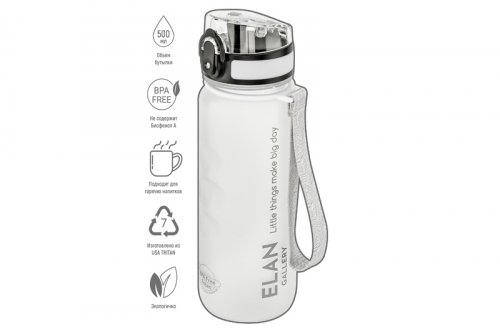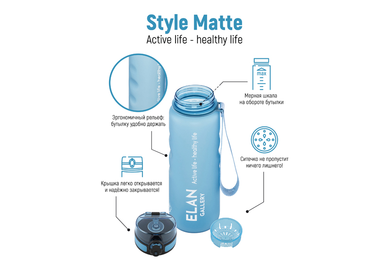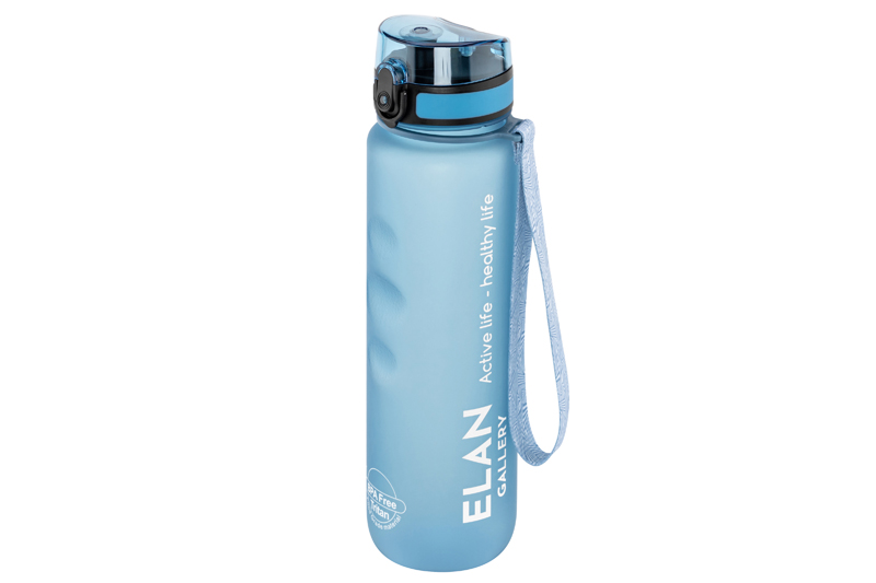 Бутылка для воды и другой жидкости Elan Gallery "Style Matte" нежного голубого цвета имеет углубления для пальцев и мерную шкалу. Следите за водным балансом и ведите здоровый и активный образ жизни! Объём ёмкости – 1 литр. Питьевая бутылочка выполнена из качественного пластика Usa Tritan. Не содержит бисфенол А и полностью безопасна для здоровья. Подходит для холодных и горячих напитков: воды, сока или чая. Бутыль для питья оснащена ситечком, поильником и клапаном (замком) на крышке. Дорожная бутылка имеет защиту от случайного открывания в сумке или рюкзаке. Имеет ремешок для переноски, что удобно для прогулки или бега. Стильный инвентарь станет незаменимой вещью на отдыхе, в путешествиях или спортзале. Бутылку на ремне с матовым покрытием удобно использовать во время поездок на велосипеде, в автомобиле или во время игры в футбол. Фляга для воды Style matte многоразовая, прочная и легкая, её удобно брать в дорогу или тренажёрный зал. Можно использовать как спорт бутылку для фитнеса и велоспорта, туризма, а также как детскую для школьника на занятиях физкультурой. Не впитывает запахи, не влияет на вкус напитков и легко отмывается. Красивая пластиковая бутылка поможет утолить жажду охлаждённым лимонадом на прогулке, тренировке или в школе. Не подходит для СВЧ, ПММ, стерилизатора. Станет приятным подарком мужчинам и женщинам. Такой сюрприз особенно придётся по вкусу спортсменам: футболисту или любительнице гимнастики и танцев. Станет прекрасным дополнением вашей коллекции походного и туристического инвентаря. В коллекции Elan Gallery представлено много посуды и товаров для дома на любой вкус. Спортивные аксессуары серии Style matte помогут следить за водным балансом и пить любимые напитки, где бы вы ни находились!
