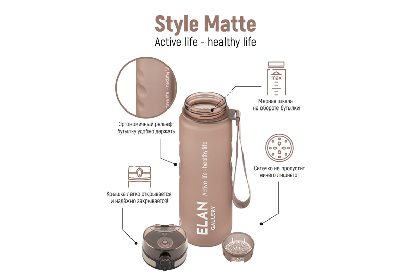 Бутылка для воды и другой жидкости Elan Gallery "Style Matte" в оттенке капучино имеет углубления для пальцев и мерную шкалу. Следите за водным балансом и ведите здоровый и активный образ жизни! Объём ёмкости – 1 литр. Питьевая бутылочка выполнена из качественного пластика Usa Tritan. Не содержит бисфенол А и полностью безопасна для здоровья. Подходит для холодных и горячих напитков: воды, сока или чая. Бутыль для питья оснащена ситечком, поильником и клапаном (замком) на крышке. Дорожная бутылка имеет защиту от случайного открывания в сумке или рюкзаке. Имеет ремешок для переноски, что удобно для прогулки или бега. Стильный инвентарь станет незаменимой вещью на отдыхе, в путешествиях или спортзале. Бутылку на ремне с матовым покрытием удобно использовать во время поездок на велосипеде, в автомобиле или во время игры в футбол. Фляга для воды Style matte многоразовая, прочная и легкая, её удобно брать в дорогу или тренажёрный зал. Можно использовать как спорт бутылку для фитнеса и велоспорта, туризма, а также как детскую для школьника на занятиях физкультурой. Не впитывает запахи, не влияет на вкус напитков и легко отмывается. Красивая пластиковая бутылка поможет утолить жажду охлаждённым лимонадом на прогулке, тренировке или в школе. Не подходит для СВЧ, ПММ, стерилизатора. Станет приятным подарком мужчинам и женщинам. Такой сюрприз особенно придётся по вкусу спортсменам: футболисту или любительнице гимнастики и танцев. Станет прекрасным дополнением вашей коллекции походного и туристического инвентаря. В коллекции Elan Gallery представлено много посуды и товаров для дома на любой вкус. Спортивные аксессуары серии Style matte помогут следить за водным балансом и пить любимые напитки, где бы вы ни находились!