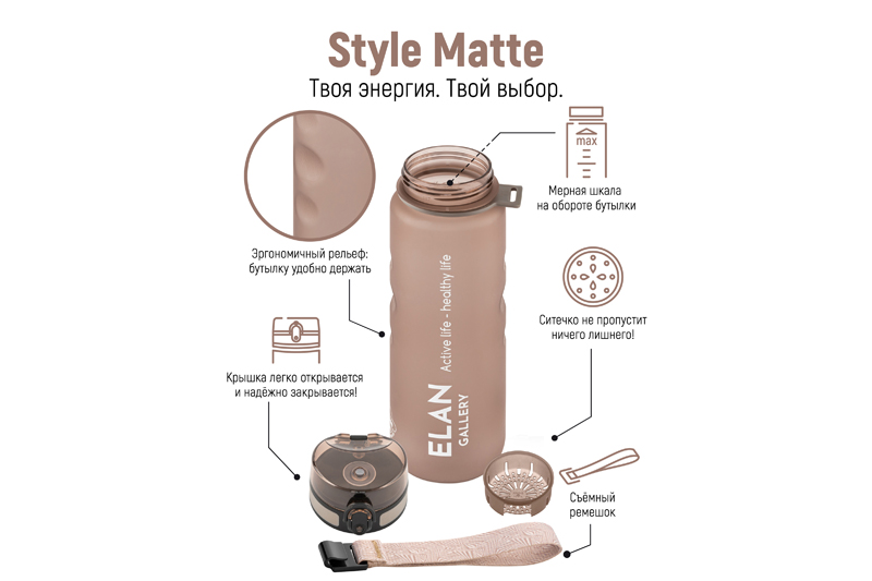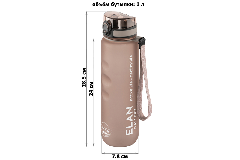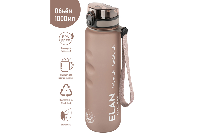 Бутылка для воды «Style Matte» от Elan Gallery – это практичное и стильное решение для ценителей активного образа жизни. Размер ёмкости – 7,8х7,8х28,5 см. Высота до крышки – 24 см. Объём – 1 литр. Изделие выполнено из тритана – прочного, безопасного материала, не содержащего бисфенол А. Этот пластик не впитывает запахи и не влияет на вкус напитков. Бутылочка подходит как для холодной, так и для горячей жидкости. Освежитесь любимыми летними напитками в жару или согрейтесь ароматным чаем зимой! Матовое покрытие и углубления для пальцев обеспечивают комфортное использование на прогулке, в офисе и на тренировке в зале. Надёжная крышка с герметичным клапаном препятствует проливанию, а встроенное ситечко позволит заваривать напитки с травами и фруктами. С удобным ремешком бутылку можно закрепить на рюкзаке или запястье – это позволяет брать её в путешествия, поездку на велосипеде или автомобиле. Многоразовая дорожная бутылка подходит как для туризма, так и для пикника на природе. Удобная форма делает её не только туристическим, но и спортивным инвентарём. Большая пластиковая ёмкость для питья – прекрасный вариант для занятий фитнесом, йогой или бегом в спортзале или на свежем воздухе. Она также дополнит занятия велоспортом в качестве велосипедного аксессуара. Это надёжный помощник спортсменам во время игры в футбол или волейбол, занятий гимнастикой и танцами. Подходит как для взрослых, так и для школьников – её можно взять в школу и на занятия физкультурой. Благодаря универсальному дизайну и цвету капучино она подойдёт как девочкам, так и мальчикам в качестве школьного аксессуара. Функциональная бутылка в дизайнерской картонной упаковке – это готовый подарок для женщин и мужчин. Не подходит для микроволновой печи, посудомоечной машины и стерилизатора. В коллекции бренда Элан Галерея представлена разнообразная посуда и товары для дома на любой вкус. Спортивные аксессуары из серии «Style Matte» помогут следить за водным балансом, где бы вы ни находились!