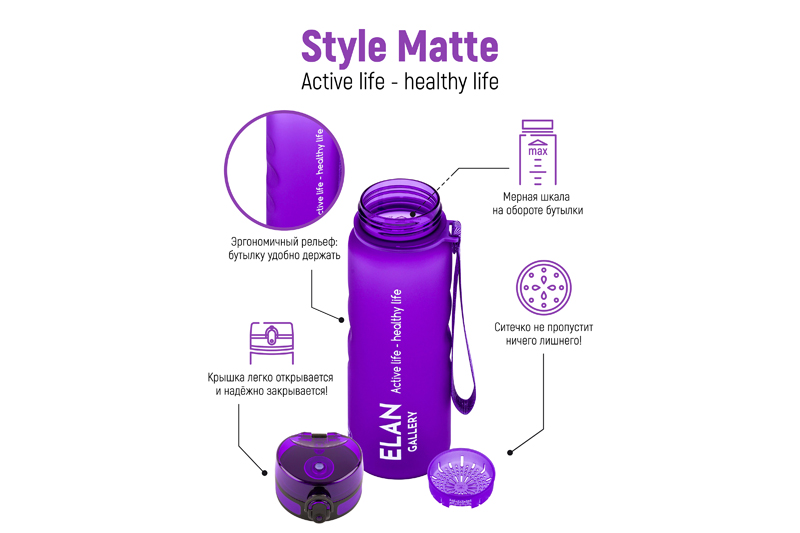 Бутылка для воды и другой жидкости Elan Gallery "Style Matte" лавандового цвета имеет углубления для пальцев и мерную шкалу. Следите за водным балансом и ведите здоровый и активный образ жизни! Объём ёмкости – 1 литр. Питьевая бутылочка выполнена из качественного пластика Usa Tritan. Не содержит бисфенол А и полностью безопасна для здоровья. Подходит для холодных и горячих напитков: воды, сока или чая. Бутыль для питья оснащена ситечком, поильником и клапаном (замком) на крышке. Дорожная бутылка имеет защиту от случайного открывания в сумке или рюкзаке. Имеет ремешок для переноски, что удобно для прогулки или бега. Стильный инвентарь станет незаменимой вещью на отдыхе, в путешествиях или спортзале. Бутылку на ремне с матовым покрытием удобно использовать во время поездок на велосипеде, в автомобиле или во время игры в футбол. Фляга для воды Style matte многоразовая, прочная и легкая, её удобно брать в дорогу или тренажёрный зал. Можно использовать как спорт бутылку для фитнеса и велоспорта, туризма, а также как детскую для школьника на занятиях физкультурой. Не впитывает запахи, не влияет на вкус напитков и легко отмывается. Красивая пластиковая бутылка поможет утолить жажду охлаждённым лимонадом на прогулке, тренировке или в школе. Не подходит для СВЧ, ПММ, стерилизатора. Станет приятным подарком мужчинам и женщинам. Такой сюрприз особенно придётся по вкусу спортсменам: футболисту или любительнице гимнастики и танцев. Станет прекрасным дополнением вашей коллекции походного и туристического инвентаря. В коллекции Elan Gallery представлено много посуды и товаров для дома на любой вкус. Спортивные аксессуары серии Style matte помогут следить за водным балансом и пить любимые напитки, где бы вы ни находились!