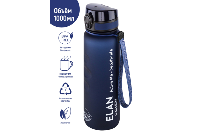 Бутылка для воды «Style Matte» от Elan Gallery – это практичное и стильное решение для ценителей активного образа жизни. Размер ёмкости – 7,8х7,8х28,5 см. Высота до крышки – 24 см. Объём – 1 литр. Изделие выполнено из тритана – прочного, безопасного материала, не содержащего бисфенол А. Этот пластик не впитывает запахи и не влияет на вкус напитков. Бутылочка подходит как для холодной, так и для горячей жидкости. Освежитесь любимыми летними напитками в жару или согрейтесь ароматным чаем зимой! Матовое покрытие и углубления для пальцев обеспечивают комфортное использование на прогулке, в офисе и на тренировке в зале. Надёжная крышка с герметичным клапаном препятствует проливанию, а встроенное ситечко позволит заваривать напитки с травами и фруктами. С удобным ремешком бутылку можно закрепить на рюкзаке или запястье – это позволяет брать её в путешествия, поездку на велосипеде или автомобиле. Многоразовая дорожная бутылка подходит как для туризма, так и для пикника на природе. Удобная форма делает её не только туристическим, но и спортивным инвентарём. Большая пластиковая ёмкость для питья – прекрасный вариант для занятий фитнесом, йогой или бегом в спортзале или на свежем воздухе. Она также дополнит занятия велоспортом в качестве велосипедного аксессуара. Это надёжный помощник спортсменам во время игры в футбол или волейбол, занятий гимнастикой и танцами. Подходит как для взрослых, так и для школьников – её можно взять в школу и на занятия физкультурой. Благодаря универсальному дизайну и тёмно-синему цвету она подойдёт как девочкам, так и мальчикам в качестве школьного аксессуара. Функциональная бутылка в дизайнерской картонной упаковке – это готовый подарок для женщин и мужчин. Не подходит для микроволновой печи, посудомоечной машины и стерилизатора. В коллекции бренда Элан Галерея представлена разнообразная посуда и товары для дома на любой вкус. Спортивные аксессуары из серии «Style Matte» помогут следить за водным балансом, где бы вы ни находились!