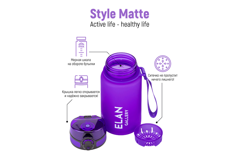 Бутылка для воды и другой жидкости Elan Gallery "Style Matte" лавандового цвета имеет мерную шкалу. Следите за водным балансом и ведите здоровый и активный образ жизни! Объём ёмкости – 350 мл. Небольшая питьевая бутылочка выполнена из качественного пластика Usa Tritan. Не содержит бисфенол А и полностью безопасна для здоровья. Подходит для холодных и горячих напитков: воды, сока или чая. Маленькая бутыль для питья оснащена ситечком, поильником и клапаном (замком) на крышке. Дорожная бутылка имеет защиту от случайного открывания в сумке или рюкзаке. Имеет ремешок для переноски, что удобно для прогулки или бега. Стильный инвентарь станет незаменимой вещью на отдыхе, в путешествиях или спортзале. Мини бутылку на ремне с матовым покрытием удобно использовать во время поездок на велосипеде, в автомобиле или во время игры в футбол. Фляга для воды Style matte многоразовая, прочная и легкая, её удобно брать в дорогу или тренажёрный зал. Можно использовать как спорт бутылку для фитнеса и велоспорта, туризма, а также как детскую для школьника на занятиях физкультурой. Не впитывает запахи, не влияет на вкус напитков и легко отмывается. Красивая пластиковая бутылка поможет утолить жажду охлаждённым лимонадом на прогулке, тренировке или в школе. Не подходит для СВЧ, ПММ, стерилизатора. Станет приятным подарком мужчинам и женщинам. Такой сюрприз особенно придётся по вкусу спортсменам: футболисту или любительнице гимнастики и танцев. Станет прекрасным дополнением вашей коллекции походного и туристического инвентаря. В коллекции Elan Gallery представлено много посуды и товаров для дома на любой вкус. Спортивные аксессуары серии Style matte помогут следить за водным балансом и пить любимые напитки, где бы вы ни находились!