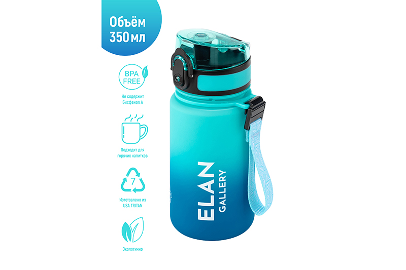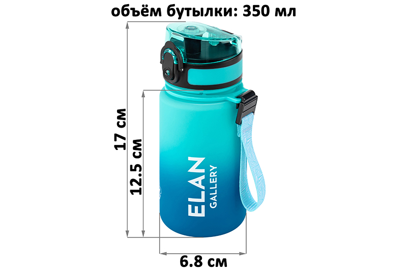 Бутылка для воды и другой жидкости 6,8х6,8х17 см Elan Gallery "Style Matte" со стильным градиентом морского оттенка имеет мерную шкалу с отметками по объему. Следите за водным балансом и ведите здоровый и активный образ жизни! Объём ёмкости – 350 мл, высота до крышки 12,5 см. Питьевая бутылочка выполнена из качественного пластика Usa Tritan. Материал не содержит бисфенол А, не выделяет вредных веществ, не имеет запаха. Подходит для холодных и горячих напитков: воды, сока или чая. На поверхности имеет углубления для пальцев, что обеспечивает удобный захват и предотвращает выскальзывание из рук даже во время бега. Бутыль для питья оснащена ситечком, поильником и клапаном (замком) на крышке. Дорожная бутылка имеет защиту от случайного открывания в сумке или рюкзаке. Ремешок для подвешивания съёмный: отсоедините черное крепление в виде крючка от бирюзового кольца. Стильный инвентарь станет незаменимой вещью на отдыхе, в путешествиях или спортзале. Бутылку на ремне с матовым покрытием удобно использовать во время поездок на велосипеде, в автомобиле или во время игры в футбол. Фляга для воды Style matte многоразовая, прочная и легкая, её удобно брать в дорогу или тренажёрный зал. Можно использовать как спорт бутылку для фитнеса и велоспорта, туризма, а также как детскую для школьника на занятиях физкультурой. Не впитывает запахи, не влияет на вкус напитков и легко отмывается. Красивая пластиковая бутылка поможет утолить жажду охлаждённым лимонадом на прогулке, тренировке или в школе. Не подходит для СВЧ, ПММ, стерилизатора. Станет приятным подарком мужчинам и женщинам. Такой сюрприз особенно придётся по вкусу спортсменам: футболисту или любительнице гимнастики и танцев. Станет прекрасным дополнением вашей коллекции походного и туристического инвентаря. В коллекции Elan Gallery представлено много посуды и товаров для дома на любой вкус. Спортивные аксессуары серии Style matte помогут следить за водным балансом и пить любимые напитки, где бы вы не находились.