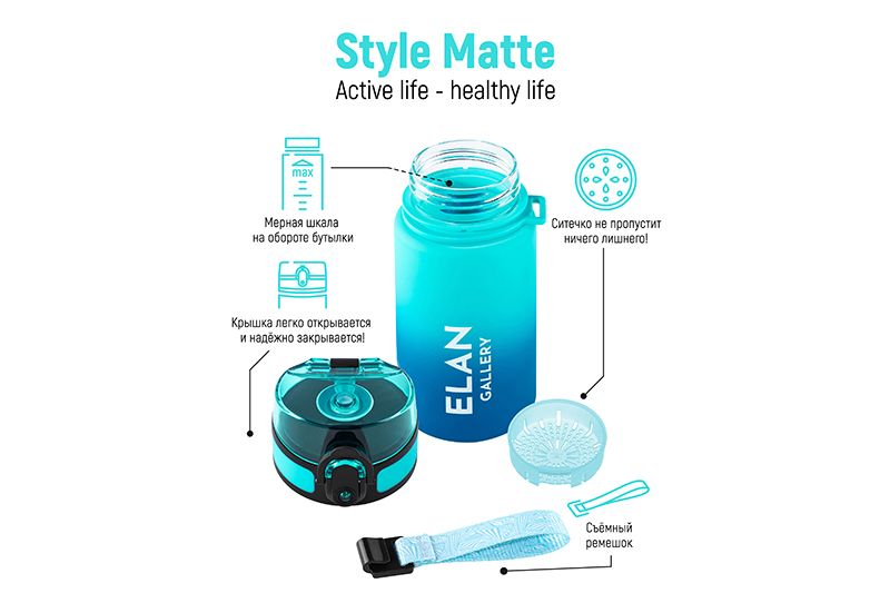 Бутылка для воды «Style Matte» от Elan Gallery – это практичное и стильное решение для ценителей активного образа жизни. Размер ёмкости – 6,8х6,8х17 см. Высота до крышки – 12,5 см. Объём – 350 мл. Изделие выполнено из тритана – прочного, безопасного материала, не содержащего бисфенол А. Этот пластик не впитывает запахи и не влияет на вкус напитков. Бутылочка подходит как для холодной, так и для горячей жидкости. Освежитесь любимыми летними напитками в жару или согрейтесь ароматным чаем зимой! Матовое покрытие обеспечивает комфортное использование на прогулке, в офисе и на тренировке в зале. Надёжная крышка с герметичным клапаном препятствует проливанию, а встроенное ситечко позволит заваривать напитки с травами и фруктами. С удобным ремешком бутылку можно закрепить на рюкзаке или запястье – это позволяет брать её в путешествия, поездку на велосипеде или автомобиле. Многоразовая дорожная бутылка подходит как для туризма, так и для пикника на природе. Удобная форма делает её не только туристическим, но и спортивным инвентарём. Пластиковая ёмкость для питья – прекрасный вариант для занятий фитнесом, йогой или бегом в спортзале или на свежем воздухе. Она также дополнит занятия велоспортом в качестве велосипедного аксессуара. Это надёжный помощник спортсменам во время игры в футбол или волейбол, занятий гимнастикой и танцами. Подходит как для взрослых, так и для школьников – её можно взять в школу и на занятия физкультурой. Благодаря универсальному дизайну и морскому цвету она подойдёт как девочкам, так и мальчикам в качестве школьного аксессуара. Функциональная бутылка в дизайнерской картонной упаковке – это готовый подарок для женщин и мужчин. Не подходит для микроволновой печи, посудомоечной машины и стерилизатора. В коллекции бренда Элан Галерея представлена разнообразная посуда и товары для дома на любой вкус. Спортивные аксессуары из серии «Style Matte» помогут следить за водным балансом, где бы вы ни находились!