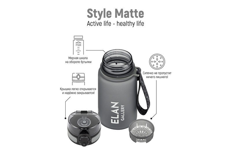Бутылка для воды и другой жидкости Elan Gallery "Style Matte" серого цвета имеет мерную шкалу. Следите за водным балансом и ведите здоровый и активный образ жизни! Объём ёмкости – 350 мл. Небольшая питьевая бутылочка выполнена из качественного пластика Usa Tritan. Не содержит бисфенол А и полностью безопасна для здоровья. Подходит для холодных и горячих напитков: воды, сока или чая. Маленькая бутыль для питья оснащена ситечком, поильником и клапаном (замком) на крышке. Дорожная бутылка имеет защиту от случайного открывания в сумке или рюкзаке. Имеет ремешок для переноски, что удобно для прогулки или бега. Стильный инвентарь станет незаменимой вещью на отдыхе, в путешествиях или спортзале. Мини бутылку на ремне с матовым покрытием удобно использовать во время поездок на велосипеде, в автомобиле или во время игры в футбол. Фляга для воды Style matte многоразовая, прочная и легкая, её удобно брать в дорогу или тренажёрный зал. Можно использовать как спорт бутылку для фитнеса и велоспорта, туризма, а также как детскую для школьника на занятиях физкультурой. Не впитывает запахи, не влияет на вкус напитков и легко отмывается. Красивая пластиковая бутылка поможет утолить жажду охлаждённым лимонадом на прогулке, тренировке или в школе. Не подходит для СВЧ, ПММ, стерилизатора. Станет приятным подарком мужчинам и женщинам. Такой сюрприз особенно придётся по вкусу спортсменам: футболисту или любительнице гимнастики и танцев. Станет прекрасным дополнением вашей коллекции походного и туристического инвентаря. В коллекции Elan Gallery представлено много посуды и товаров для дома на любой вкус. Спортивные аксессуары серии Style matte помогут следить за водным балансом и пить любимые напитки, где бы вы ни находились!