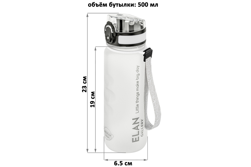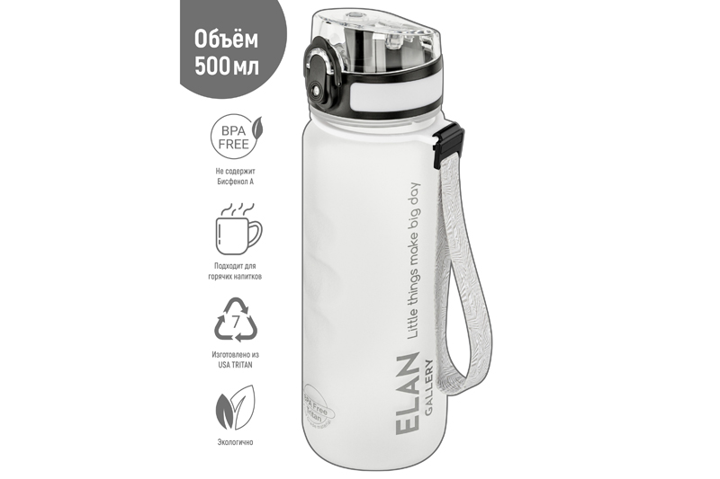 Бутылка для воды «Style Matte» от Elan Gallery – это практичное и стильное решение для ценителей активного образа жизни. Размер ёмкости – 6,5х6,5х23 см. Высота до крышки – 19 см. Объём – 500 мл. Изделие выполнено из тритана – прочного, безопасного материала, не содержащего бисфенол А. Этот пластик не впитывает запахи и не влияет на вкус напитков. Бутылочка подходит как для холодной, так и для горячей жидкости. Освежитесь любимыми летними напитками в жару или согрейтесь ароматным чаем зимой! Матовое покрытие и углубления для пальцев обеспечивают комфортное использование на прогулке, в офисе и на тренировке в зале. Надёжная крышка с герметичным клапаном препятствует проливанию, а встроенное ситечко позволит заваривать напитки с травами и фруктами. С удобным ремешком бутылку можно закрепить на рюкзаке или запястье – это позволяет брать её в путешествия, поездку на велосипеде или автомобиле. Многоразовая дорожная бутылка подходит как для туризма, так и для пикника на природе. Удобная форма делает её не только туристическим, но и спортивным инвентарём. Пластиковая ёмкость для питья – прекрасный вариант для занятий фитнесом, йогой или бегом в спортзале или на свежем воздухе. Она также дополнит занятия велоспортом в качестве велосипедного аксессуара. Это надёжный помощник спортсменам во время игры в футбол или волейбол, занятий гимнастикой и танцами. Подходит как для взрослых, так и для школьников – её можно взять в школу и на занятия физкультурой. Благодаря универсальному дизайну и белому цвету она подойдёт как девочкам, так и мальчикам в качестве школьного аксессуара. Функциональная бутылка в дизайнерской картонной упаковке – это готовый подарок для женщин и мужчин. Не подходит для микроволновой печи, посудомоечной машины и стерилизатора. В коллекции бренда Элан Галерея представлена разнообразная посуда и товары для дома на любой вкус. Спортивные аксессуары из серии «Style Matte» помогут следить за водным балансом, где бы вы ни находились!
