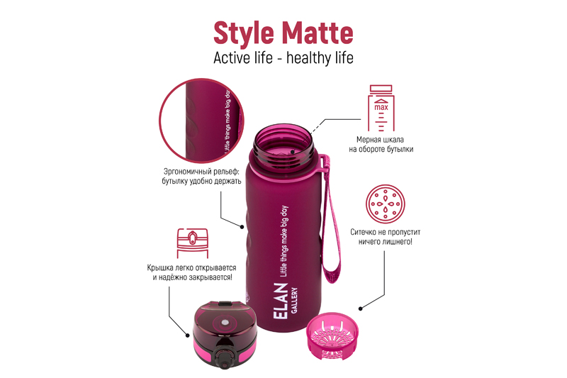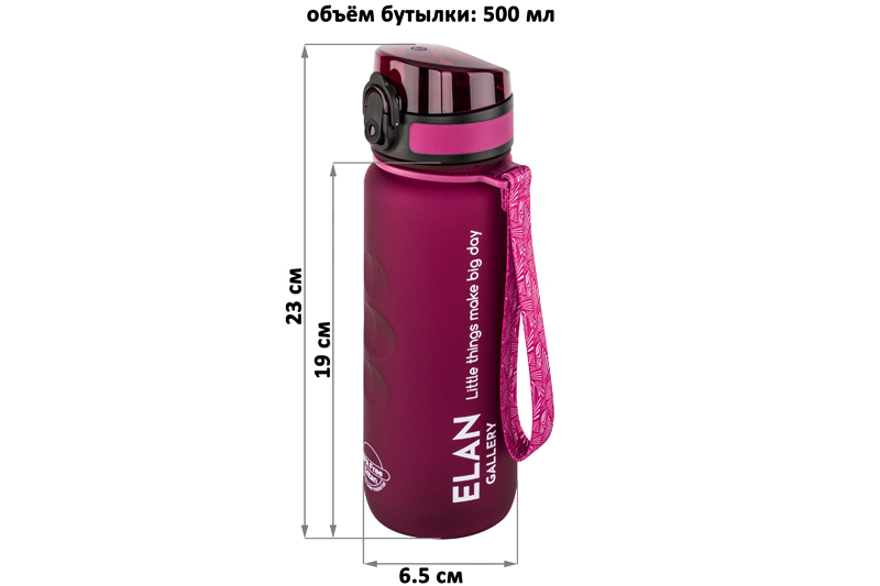 Бутылка для воды и другой жидкости Elan Gallery "Style Matte" бордового цвета имеет углубления для пальцев и мерную шкалу. Следите за водным балансом и ведите здоровый и активный образ жизни! Объём ёмкости – 500 мл. Питьевая бутылочка выполнена из качественного пластика Usa Tritan. Не содержит бисфенол А и полностью безопасна для здоровья. Подходит для холодных и горячих напитков: воды, сока или чая. Бутыль для питья оснащена ситечком, поильником и клапаном (замком) на крышке. Дорожная бутылка имеет защиту от случайного открывания в сумке или рюкзаке. Имеет ремешок для переноски, что удобно для прогулки или бега. Стильный инвентарь станет незаменимой вещью на отдыхе, в путешествиях или спортзале. Бутылку на ремне с матовым покрытием удобно использовать во время поездок на велосипеде, в автомобиле или во время игры в футбол. Фляга для воды Style matte многоразовая, прочная и легкая, её удобно брать в дорогу или тренажёрный зал. Можно использовать как спорт бутылку для фитнеса и велоспорта, туризма, а также как детскую для школьника на занятиях физкультурой. Не впитывает запахи, не влияет на вкус напитков и легко отмывается. Красивая пластиковая бутылка поможет утолить жажду охлаждённым лимонадом на прогулке, тренировке или в школе. Не подходит для СВЧ, ПММ, стерилизатора. Станет приятным подарком мужчинам и женщинам. Такой сюрприз особенно придётся по вкусу спортсменам: футболисту или любительнице гимнастики и танцев. Станет прекрасным дополнением вашей коллекции походного и туристического инвентаря. В коллекции Elan Gallery представлено много посуды и товаров для дома на любой вкус. Спортивные аксессуары серии Style matte помогут следить за водным балансом и пить любимые напитки, где бы вы ни находились!