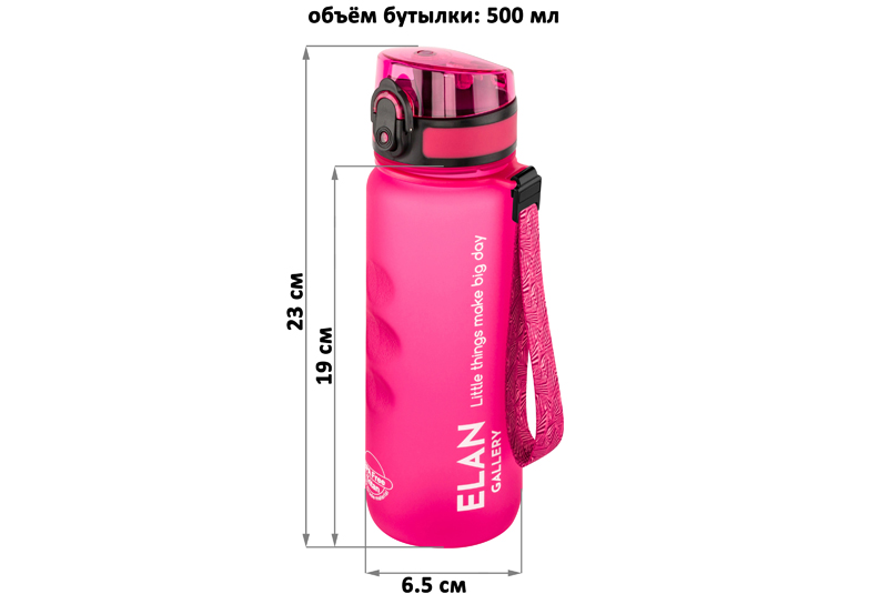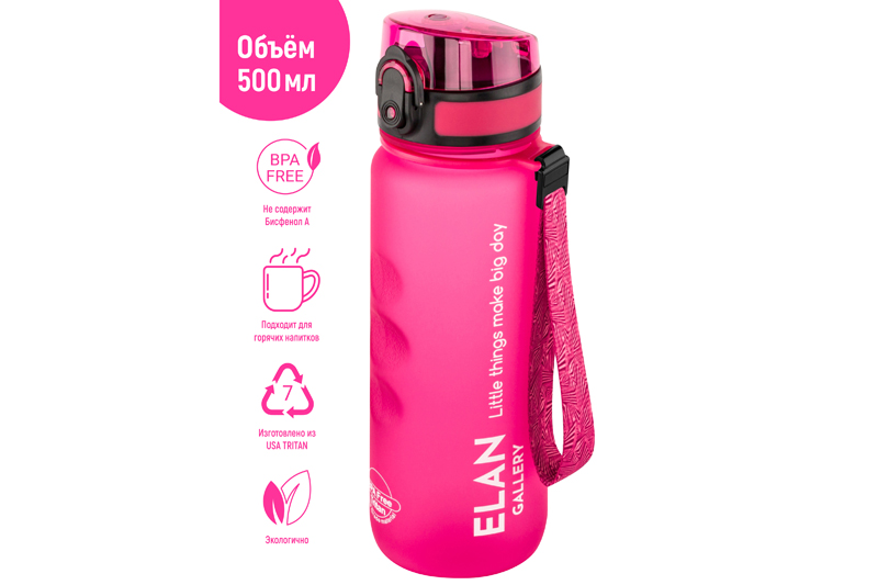 Бутылка для воды «Style Matte» от Elan Gallery – это практичное и стильное решение для ценителей активного образа жизни. Размер ёмкости – 6,5х6,5х23 см. Высота до крышки – 19 см. Объём – 500 мл. Изделие выполнено из тритана – прочного, безопасного материала, не содержащего бисфенол А. Этот пластик не впитывает запахи и не влияет на вкус напитков. Бутылочка подходит как для холодной, так и для горячей жидкости. Освежитесь любимыми летними напитками в жару или согрейтесь ароматным чаем зимой! Матовое покрытие и углубления для пальцев обеспечивают комфортное использование на прогулке, в офисе и на тренировке в зале. Надёжная крышка с герметичным клапаном препятствует проливанию, а встроенное ситечко позволит заваривать напитки с травами и фруктами. С удобным ремешком бутылку можно закрепить на рюкзаке или запястье – это позволяет брать её в путешествия, поездку на велосипеде или автомобиле. Многоразовая дорожная бутылка подходит как для туризма, так и для пикника на природе. Удобная форма делает её не только туристическим, но и спортивным инвентарём. Пластиковая ёмкость для питья – прекрасный вариант для занятий фитнесом, йогой или бегом в спортзале или на свежем воздухе. Она также дополнит занятия велоспортом в качестве велосипедного аксессуара. Это надёжный помощник спортсменам во время игры в футбол или волейбол, занятий гимнастикой и танцами. Подходит как для взрослых, так и для школьников – её можно взять в школу и на занятия физкультурой. Благодаря универсальному дизайну и цвету фуксия она подойдёт как девочкам, так и мальчикам в качестве школьного аксессуара. Функциональная бутылка в дизайнерской картонной упаковке – это готовый подарок для женщин и мужчин. Не подходит для микроволновой печи, посудомоечной машины и стерилизатора. В коллекции бренда Элан Галерея представлена разнообразная посуда и товары для дома на любой вкус. Спортивные аксессуары из серии «Style Matte» помогут следить за водным балансом, где бы вы ни находились!