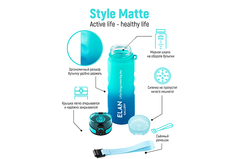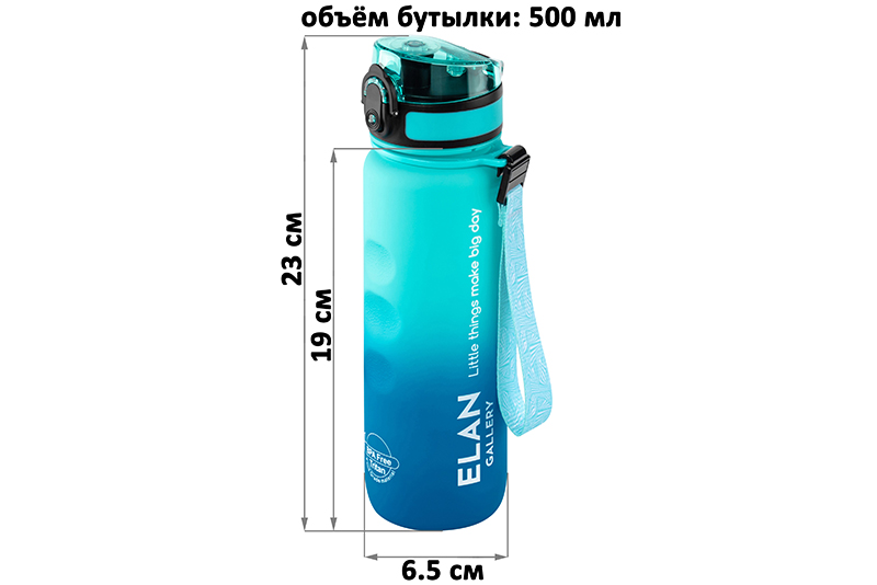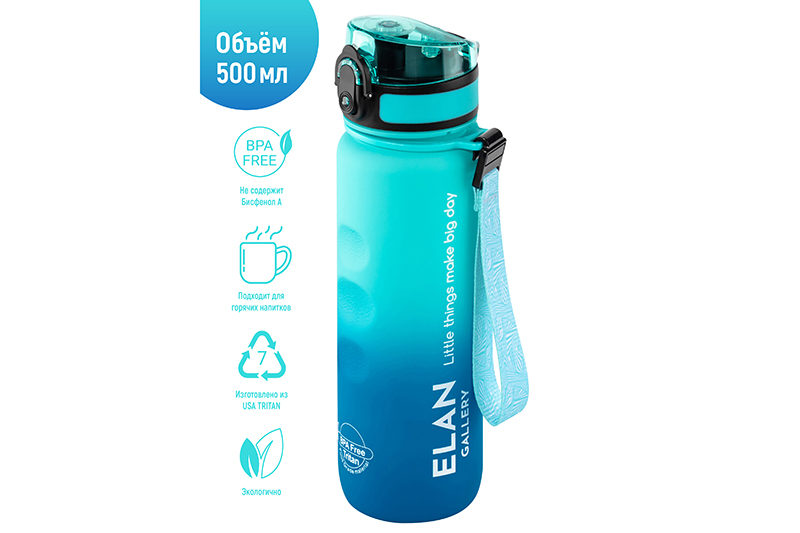 Бутылка для воды и другой жидкости 6,5х6,5х23 см Elan Gallery "Style Matte" со стильным градиентом морского оттенка имеет мерную шкалу с отметками по объему. Следите за водным балансом и ведите здоровый и активный образ жизни! Объём ёмкости – 500 мл, высота до крышки 19 см. Питьевая бутылочка выполнена из качественного пластика Usa Tritan. Материал не содержит бисфенол А, не выделяет вредных веществ, не имеет запаха. Подходит для холодных и горячих напитков: воды, сока или чая. На поверхности имеет углубления для пальцев, что обеспечивает удобный захват и предотвращает выскальзывание из рук даже во время бега. Бутыль для питья оснащена ситечком, поильником и клапаном (замком) на крышке. Дорожная бутылка имеет защиту от случайного открывания в сумке или рюкзаке. Ремешок для подвешивания съёмный: отсоедините черное крепление в виде крючка от бирюзового кольца. Стильный инвентарь станет незаменимой вещью на отдыхе, в путешествиях или спортзале. Бутылку на ремне с матовым покрытием удобно использовать во время поездок на велосипеде, в автомобиле или во время игры в футбол. Фляга для воды Style matte многоразовая, прочная и легкая, её удобно брать в дорогу или тренажёрный зал. Можно использовать как спорт бутылку для фитнеса и велоспорта, туризма, а также как детскую для школьника на занятиях физкультурой. Не впитывает запахи, не влияет на вкус напитков и легко отмывается. Красивая пластиковая бутылка поможет утолить жажду охлаждённым лимонадом на прогулке, тренировке или в школе. Не подходит для СВЧ, ПММ, стерилизатора. Станет приятным подарком мужчинам и женщинам. Такой сюрприз особенно придётся по вкусу спортсменам: футболисту или любительнице гимнастики и танцев. Станет прекрасным дополнением вашей коллекции походного и туристического инвентаря. В коллекции Elan Gallery представлено много посуды и товаров для дома на любой вкус. Спортивные аксессуары серии Style matte помогут следить за водным балансом и пить любимые напитки, где бы вы не находились.