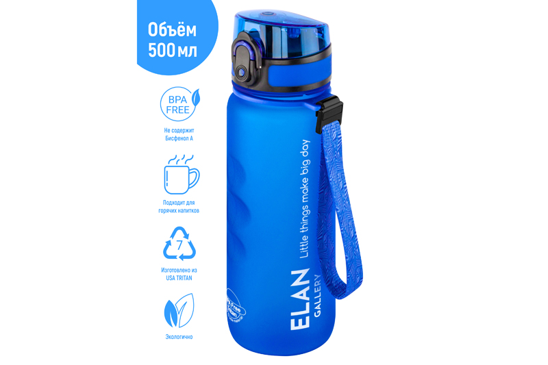 Бутылка для воды «Style Matte» от Elan Gallery – это практичное и стильное решение для ценителей активного образа жизни. Размер ёмкости – 6,5х6,5х23 см. Высота до крышки – 19 см. Объём – 500 мл. Изделие выполнено из тритана – прочного, безопасного материала, не содержащего бисфенол А. Этот пластик не впитывает запахи и не влияет на вкус напитков. Бутылочка подходит как для холодной, так и для горячей жидкости. Освежитесь любимыми летними напитками в жару или согрейтесь ароматным чаем зимой! Матовое покрытие и углубления для пальцев обеспечивают комфортное использование на прогулке, в офисе и на тренировке в зале. Надёжная крышка с герметичным клапаном препятствует проливанию, а встроенное ситечко позволит заваривать напитки с травами и фруктами. С удобным ремешком бутылку можно закрепить на рюкзаке или запястье – это позволяет брать её в путешествия, поездку на велосипеде или автомобиле. Многоразовая дорожная бутылка подходит как для туризма, так и для пикника на природе. Удобная форма делает её не только туристическим, но и спортивным инвентарём. Пластиковая ёмкость для питья – прекрасный вариант для занятий фитнесом, йогой или бегом в спортзале или на свежем воздухе. Она также дополнит занятия велоспортом в качестве велосипедного аксессуара. Это надёжный помощник спортсменам во время игры в футбол или волейбол, занятий гимнастикой и танцами. Подходит как для взрослых, так и для школьников – её можно взять в школу и на занятия физкультурой. Благодаря универсальному дизайну и небесному цвету она подойдёт как девочкам, так и мальчикам в качестве школьного аксессуара. Функциональная бутылка в дизайнерской картонной упаковке – это готовый подарок для женщин и мужчин. Не подходит для микроволновой печи, посудомоечной машины и стерилизатора. В коллекции бренда Элан Галерея представлена разнообразная посуда и товары для дома на любой вкус. Спортивные аксессуары из серии «Style Matte» помогут следить за водным балансом, где бы вы ни находились!