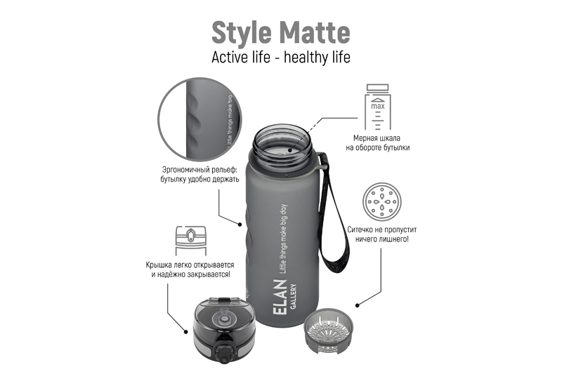 Бутылка для воды и другой жидкости Elan Gallery "Style Matte" серого цвета имеет углубления для пальцев и мерную шкалу. Следите за водным балансом и ведите здоровый и активный образ жизни! Объём ёмкости – 500 мл. Питьевая бутылочка выполнена из качественного пластика Usa Tritan. Не содержит бисфенол А и полностью безопасна для здоровья. Подходит для холодных и горячих напитков: воды, сока или чая. Бутыль для питья оснащена ситечком, поильником и клапаном (замком) на крышке. Дорожная бутылка имеет защиту от случайного открывания в сумке или рюкзаке. Имеет ремешок для переноски, что удобно для прогулки или бега. Стильный инвентарь станет незаменимой вещью на отдыхе, в путешествиях или спортзале. Бутылку на ремне с матовым покрытием удобно использовать во время поездок на велосипеде, в автомобиле или во время игры в футбол. Фляга для воды Style matte многоразовая, прочная и легкая, её удобно брать в дорогу или тренажёрный зал. Можно использовать как спорт бутылку для фитнеса и велоспорта, туризма, а также как детскую для школьника на занятиях физкультурой. Не впитывает запахи, не влияет на вкус напитков и легко отмывается. Красивая пластиковая бутылка поможет утолить жажду охлаждённым лимонадом на прогулке, тренировке или в школе. Не подходит для СВЧ, ПММ, стерилизатора. Станет приятным подарком мужчинам и женщинам. Такой сюрприз особенно придётся по вкусу спортсменам: футболисту или любительнице гимнастики и танцев. Станет прекрасным дополнением вашей коллекции походного и туристического инвентаря. В коллекции Elan Gallery представлено много посуды и товаров для дома на любой вкус. Спортивные аксессуары серии Style matte помогут следить за водным балансом и пить любимые напитки, где бы вы ни находились!