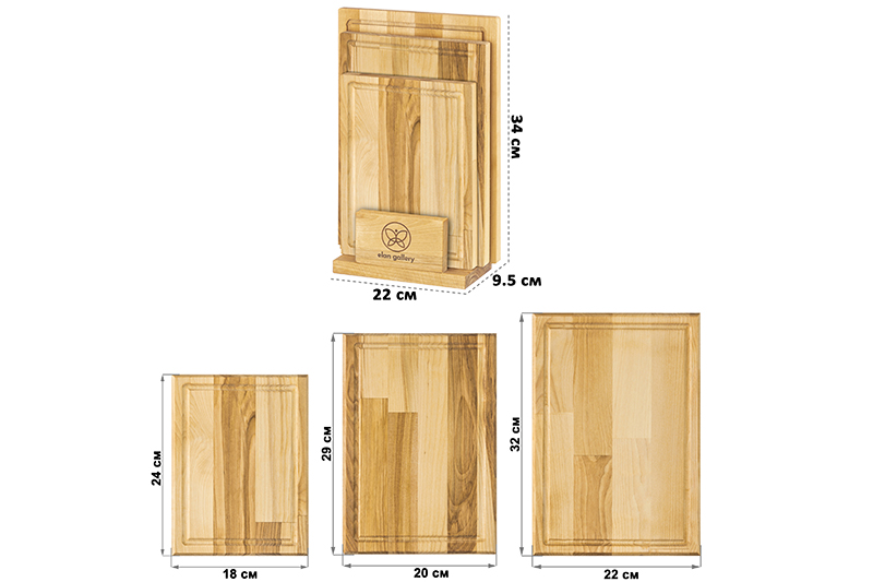 Набор состоит из трех разделочных досок и подставки. Доски выполнены из березы и различаются по размеру: 32х22х1,8 см, 29х20х1,8 см и 24х18х1,8 см. Такой набор станет не только надежным помощником в резке продуктов, но и стильным украшением кухни. По краям досок имеются канавки для жидкостей, чтобы сок от овощей и мяса не попадал на стол. Доски подходят для красивой сервировки жареного мяса, овощей и прочих блюд. Доски уже пропитаны маслом. После каждого использования протирать влажной губкой. Не замачивать в воде. После мытья под струей воды протереть насухо. Не сушить около отопительных приборов и рядом с плитой. Хранить вертикально или в подвешенном состоянии в помещении с нормальным уровнем влажности. Не использовать в качестве подставки под горячее. Не мыть химическими средствами или в посудомоечной машине. Рекомендуется не реже одного раза в месяц обрабатывать все стороны растительным маслом. Так доска прослужит долго и будет радовать красотой и функциональностью!