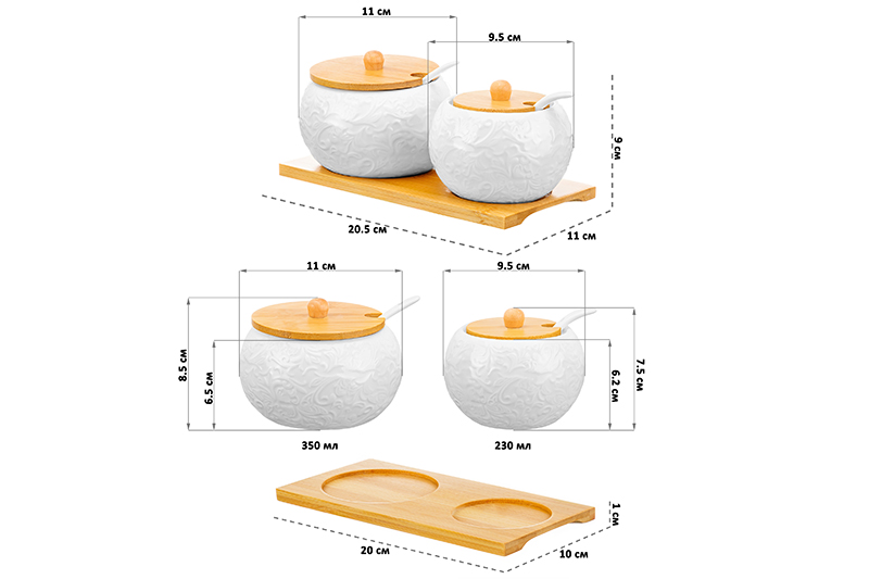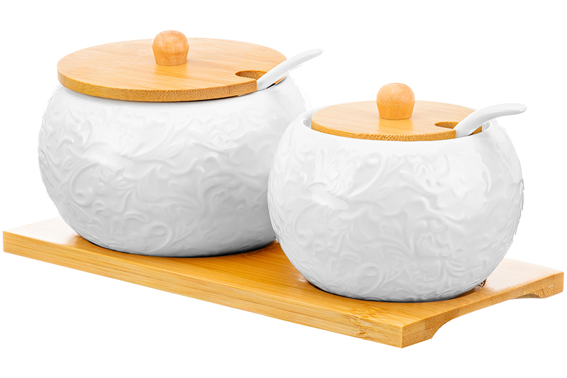 Набор Elan Gallery "Лоза" состоит из сахарницы и солонки на бамбуковой подставке. Размер сахарницы – 11х11х8,5 см, объём – 350 мл. Размер солонки – 9,5х9,5х7,5 см, объём – 250 мл. Размер бамбуковой подставки – 20х10х1 см. Ёмкости выполнены из белого фарфора и украшены рельефными узорами. Каждая баночка имеет крышку из бамбука и фарфоровую ложку. Комплект подходит не только для сахара и соли, можно использовать для мёда, варенья или джема. В банках можно хранить специи, приправы, соусы и другие продукты. Не рекомендуется применять абразивные моющие средства. Фарфоровые детали набора можно использовать в микроволновой печи и посудомоечной машине. Бамбук нельзя замачивать! Поставляется в стильной картонной упаковке. Сахарница и солонка из серии посуды "Лоза" станут украшением любой кухни или приятным подарком для ваших родных и близких!
