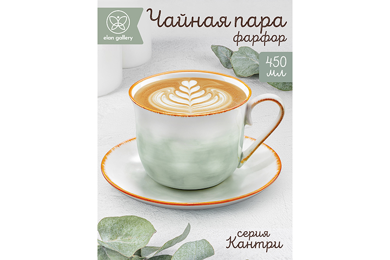 Чайная пара из серии «Кантри» от Elan Gallery предназначена для эстетичной сервировки вашего стола. Размер ёмкости – 14х11х8,5 см, объём – 450 мл. Размер блюдца – 16,5х16,5х2 см. Выполнены из высококачественного белого фарфора. Он не впитывает цвет продуктов и напитков и легко отмывается, благодаря чему надолго сохранит свою белизну. Изделия имеют необычную геометрию и украшены нежным зелёным оттенком. Окантовка имитирует натуральный древесный узор. Серия «Кантри» – это близость к природе, спокойствие и уют. Она подойдёт тем, кто хочет отдохнуть от ритма современной жизни и вернуться к неспешности и размеренности. Кофейная кружка поможет вам провести множество приятных завтраков с капучино и латте, а также уютные чайные вечера. Подойдёт ценителям чая и кофе, которые любят пить из красивой и необычной посуды. Согрейтесь зимой любимым напитком: какао с маршмэллоу, ягодным чаем, горячим шоколадом или глинтвейном. Используйте сервировочное блюдце как подставку для чашки, чтобы порадовать гостей изящной сервировкой. Положите на десертную тарелку пирожное, кусочек торта или домашнего пирога. Не рекомендуется применять абразивные моющие средства. Подходят для использования в посудомоечной машине и микроволновой печи. Поставляются в дизайнерской картонной коробке – благодаря ей вам не потребуется дополнительная подарочная упаковка. Фарфоровая коллекция «Кантри» от бренда Элан Галерея позволит вам собрать необычный сервиз в едином стиле!