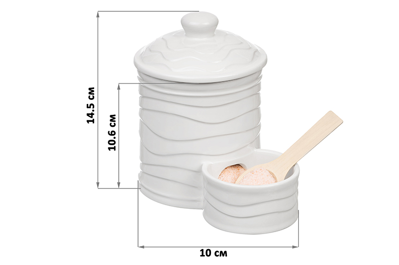 Банка из серии «Айсберг волны» предназначена для организации хранения продуктов на вашей кухне. Размер изделия – 15,5х10х14,5 см, объём – 500 мл. Высота внешней солонки – 4 см, объём – 75 мл. Выполнена из высококачественного белого фарфора и украшена рельефным узором в виде волн. Фарфор не впитывает цвет продуктов, легко отмывается и надолго сохраняет свою белизну. Ёмкость подойдёт для хранения разнообразных сыпучих продуктов. Заполните её солью или сахаром, специями и приправами, чтобы во время приготовления пищи всё необходимое было под рукой. Насыпьте внутрь чай или кофе, чтобы в любой момент заварить свежий напиток. Подайте её вместе с горячими блюдами, заполнив любимыми специями, чтобы каждый мог приправить пищу по своему вкусу. Внешний кармашек обеспечит вам быстрый доступ к продуктам, а необычная форма поможет эффективнее расходовать содержимое, предотвращая скопление остатков на дне. Маленькая деревянная ложечка позволит удобно набрать необходимое количество продуктов. Такое изделие идеально дополнит сервировку стола для любого приёма пищи! Не рекомендуется применять абразивные моющие средства. Без бамбуковой ложечки подойдёт для использования в посудомоечной машине. Бамбук нельзя замачивать! Поставляется в красивой картонной упаковке. Серия «Айсберг волны» станет изящным дополнением вашего кухонного инвентаря и позволит собрать сервиз в едином стиле!