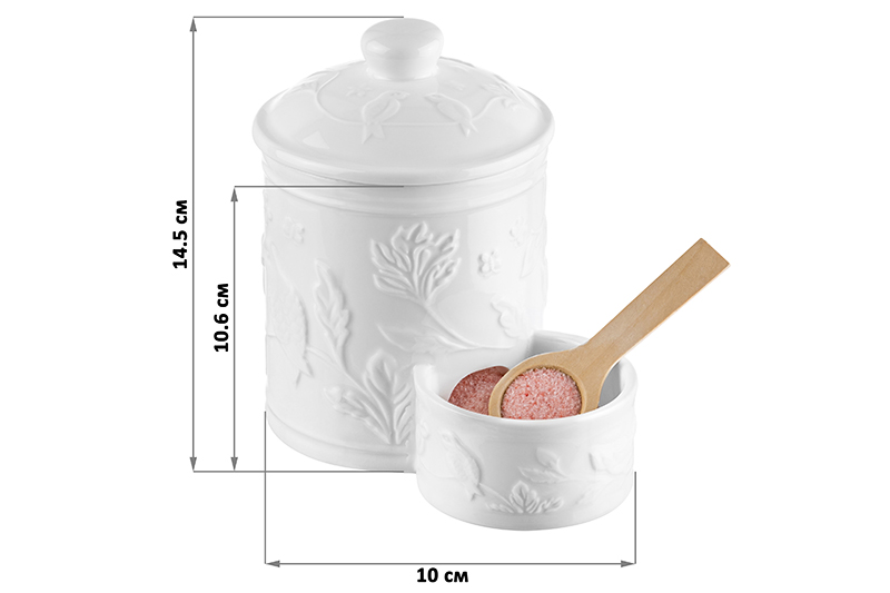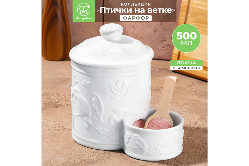 Банка из серии «Птички на ветке» предназначена для организации хранения продуктов на вашей кухне. Размер изделия – 15,5х10х14,5 см, объём – 500 мл. Высота внешней солонки – 4 см, объём – 75 мл. Выполнена из высококачественного белого фарфора и украшена рельефным узором в виде лиственных веточек, на которых сидят маленькие птички. Фарфор не впитывает цвет продуктов, легко отмывается и надолго сохраняет свою белизну. Ёмкость подойдёт для хранения разнообразных сыпучих продуктов. Заполните её солью или сахаром, специями и приправами, чтобы во время приготовления пищи всё необходимое было под рукой. Насыпьте внутрь чай или кофе, чтобы в любой момент заварить свежий напиток. Подайте её вместе с горячими блюдами, заполнив любимыми специями, чтобы каждый мог приправить пищу по своему вкусу. Внешний кармашек обеспечит вам быстрый доступ к продуктам, а необычная форма поможет эффективнее расходовать содержимое, предотвращая скопление остатков на дне. Маленькая деревянная ложечка позволит удобно набрать необходимое количество продуктов. Такое изделие идеально дополнит сервировку стола для любого приёма пищи! Не рекомендуется применять абразивные моющие средства. Без бамбуковой ложечки подойдёт для использования в посудомоечной машине. Бамбук нельзя замачивать! Поставляется в красивой картонной упаковке. Серия «Птички на ветке» станет изящным дополнением вашего кухонного инвентаря и позволит собрать сервиз в едином стиле!