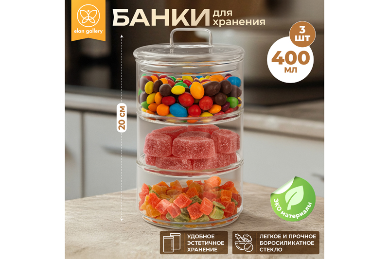 Трехсекционная банка от бренда Elan Gallery "Crystal glass" позволит компактно хранить любые продукты в вашем доме: сахар и соль, крупы, а также чай и кофе. Изготовленная из прозрачного боросиликатного стекла, она отличается прочностью, термостойкостью и эстетичным внешним видом. Размер целой трехуровневой конструкции — 11,5×11,5×20 см. Высота без крышки — 16,7 см. Каждая отдельная секция имеет объём 400 мл и размер 11×11×6 см. Трехъярусный контейнер с прозрачными стенками удобно использовать для хранения сыпучих продуктов и сладостей. Органайзер с крышкой надёжно защищает содержимое от внешних воздействий, сохраняя аромат и свежесть. Банка с секциями идеально подойдет для хранения специй и приправ, орехов и сухофруктов. Круглая этажерка отлично смотрится на полке или сервированном столе. Стенки из прозрачного стекла позволяют быстро находить нужные продукты без лишних усилий. Трёхъярусная конфетница с крышкой станет украшением интерьера кухни или столовой. Она подходит для подачи конфет, печенья или ягод. Баночку можно использовать как декоративный элемент для хранения мелочей. Компактно сложите в отсеки ватные палочки, диски и другие предметы гигиены в ванной комнате. Не рекомендуется применять абразивные моющие средства. Можно использовать в микроволновой печи и посудомоечной машине. Поставляется в стильной картонной коробке. Благодаря красочной коробочке не понадобится подарочная упаковка, если вы решите сделать сюрприз своим близким. Стеклянная емкость с крышкой — отличный выбор для тех, кто ценит аккуратность и порядок на кухне. Менажница станет универсальным элементом кухонного инвентаря и отличным подарком на любой праздник. В коллекции бренда Элан Галерея представлено много стильной посуды и функциональных товаров для дома. Выберите варианты на свой вкус!