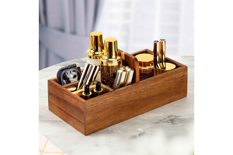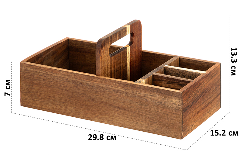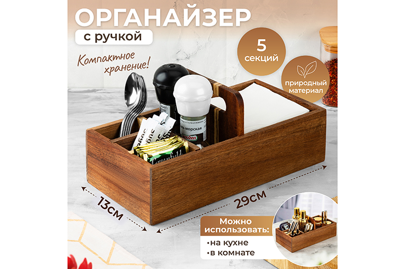 Настольный органайзер с ручкой и 5 секциями 29,8х15,2х13,3 см – это стильное решение для создания порядка в вашем доме. Выполнен из натурального дерева акации. Он привнесёт в интерьер нотки уюта и природной эстетики! 5 отделений с перегородками формируют удобные ячейки для мелочей, кухонных принадлежностей, чайных пакетиков и салфеток. Разделители не вынимаются! Размеры ячеек: 13,5х13,5х7 см, 13,5х6х7 см, 6,5х3,5х7 см и две по 6,5х4х7 см. Органайзер можно разместить на столе, полке или в шкафу. Деревянный контейнер станет компактной системой хранения пакетов со сладостями и печеньем, а также коробочек с чаем. Подойдёт к любому интерьеру кухни, прихожей или комнаты. В бокс можно поставить банки с кофе и другими сыпучими продуктами, ёмкости со специями и приправами, бутылки с маслами и столовый инвентарь. В спальне он превратится в подставку для флаконов с кремами, духов и парфюма, а также бижутерии и украшений. В него можно сложить лекарства и косметику, а благодаря удобной ручке легко переносить из одной комнаты в другую. В секции можно убрать нитки, ножницы и другие предметы для рукоделия и шитья. В прихожей поставьте органайзер на тумбочку, чтобы держать под рукой ключи, зарядки для телефона и щётки. Если вы обустраиваете детскую, органайзер послужит ящиком для канцелярии, заколок и маленьких игрушек. В офисе станет картотекой для документов или карточек. В маникюрном кабинете или салоне красоты лоток поможет организовать хранение лаков для ногтей, инструментов для маникюра и педикюра, а также других баночек и аксессуаров. Универсальный органайзер станет полезным подарком для ценителей функциональных изделий. Он гармонично дополнит интерьер квартиры или дачи. Не рекомендуется применять абразивные моющие средства. Поставляется в картонной коробке. Благодаря красочной коробочке не понадобится дополнительная подарочная упаковка. Оцените стильные товары для дома из нашей коллекции и создайте пространство, где каждая вещь будет на своём месте!