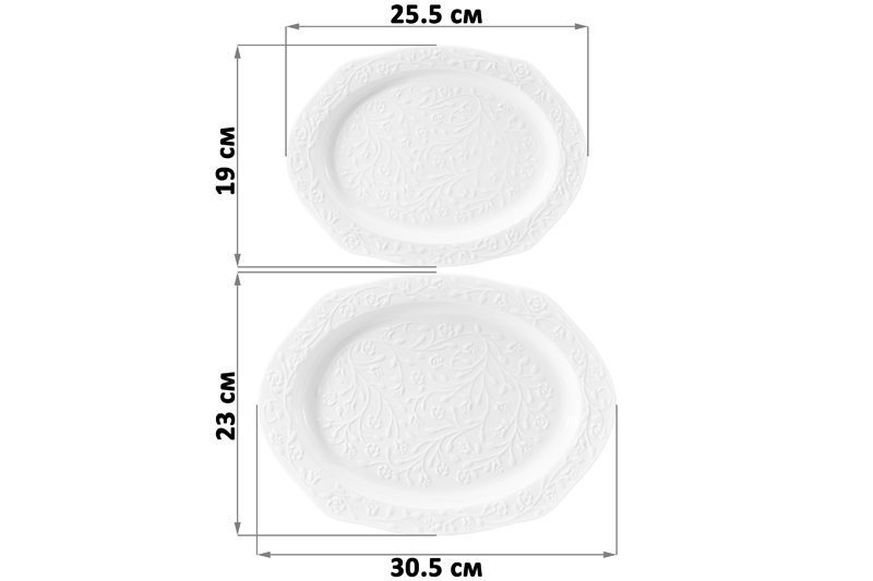 Набор 2 фигурных блюд из серии «Веточки-цветочки» от Elan Gallery предназначен для эстетичной сервировки вашего стола. Включает блюда разных размеров: 30,5х23х2 см и 25,5х19х2 см. Выполнены из высококачественного белого фарфора. Он легко отмывается и не впитывает цвет продуктов, благодаря чему надолго сохранит свою белизну. Поверхность изделий украшают рельефные узоры в виде лиственных веточек с аккуратными цветочными бутончиками. Сервировочный набор отлично подойдёт для подачи самых разнообразных угощений. Разложите на большой тарелке салат, нарезку из свежих овощей и фруктов, сыры или колбасы. Меньшая тарелка подойдёт для пасты, деликатесов из рыбы, а также для суши и роллов. Она не только идеально послужит для подачи вторых блюд, но и поможет вам изящно преподнести закуски – орешки, сухофрукты, ягоды и фруктовые дольки. Заполните блюда разнообразными сладостями – от кусочков торта и пирогов до булочек и конфет – чтобы провести незабываемое чаепитие в приятной компании. Лаконичные изделия впишутся в интерьер любой кухни, гостиной или столовой. Не рекомендуется применять абразивные моющие средства. Подходят для использования в посудомоечной машине и микроволновой печи. Поставляются в дизайнерской картонной коробке – благодаря ей вам не потребуется дополнительная подарочная упаковка. Фарфоровая сервировочная посуда будет оригинальным подарком для хозяйки, ценящей не только практичность, но и привлекательность. Серия «Веточки-цветочки» от бренда Элан Галерея станет украшением любого кухонного инвентаря и позволит собрать красивый сервиз в едином стиле!