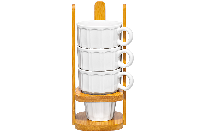 Набор 4 кружек из серии «Ампир» от Elan Gallery предназначен для эстетичной сервировки вашего стола. Полный размер комплекта – 10,5х8,5х21 см. Размер подставки – 8,5х8,5х20,5 см. Выполнена из натурального бамбука. Размер каждой ёмкости – 10х7,3х8,5 см, объём – 170 мл. Изготовлены из высококачественного белого фарфора. Он не впитывает цвет продуктов и легко отмывается, благодаря чему надолго сохраняет свою белизну. Поверхность изделия украшает элегантный ребристый рельеф. Поможет отпраздновать Широкую Масленицу со вкусом! Масленица – это чудесный повод собраться за праздничным столом и насладиться тёплой атмосферой и традиционной русской кухней. В ассортименте бренда Elan Gallery вы найдёте предметы декора и красивую посуду для приготовления и сервировки масленичных блюд. Пусть Масленичная неделя принесет вам радость и множество вкусных моментов! Декоративные кофейные кружечки помогут провести множество приятных завтраков с капучино и латте, а также уютные чайные вечера с конфетами, вафлями, другими десертами и сладостями. Подойдут ценителям чая и кофе, которые любят пить из красивой и необычной посуды. Согрейтесь зимой любимым напитком: какао с маршмэллоу, ягодным чаем и горячим шоколадом. Летом освежитесь домашним лимонадом или морсом. Благодаря деревянной подставке и штабелируемому формату кружечек вы сможете компактно хранить комплект. Не рекомендуется применять абразивные моющие средства. Без бамбуковой подставки кружки подходят для использования в посудомоечной машине и микроволновой печи. Бамбук нельзя замачивать! Поставляются в дизайнерской картонной коробке – благодаря ей вам не потребуется дополнительная подарочная упаковка. Фарфоровая сервировочная посуда будет оригинальным подарком для тех, кто ценит сочетание практичности и привлекательности. Серия «Ампир» от бренда Элан Галерея станет украшением любого кухонного инвентаря и позволит собрать красивый сервиз в едином стиле!