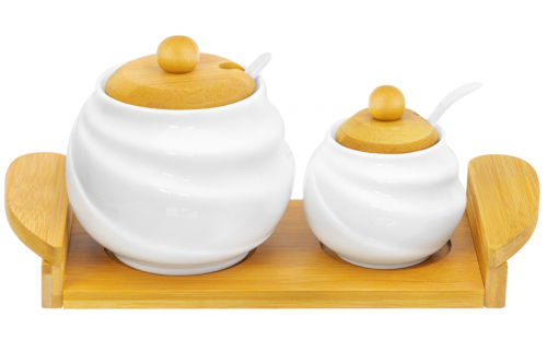 Набор серии "Сфера" состоит из сахарницы на 440 мл с фарфоровой ложкой, солонки и перечницы на деревянной подставке. Набор выполнен из высококачественного фарфора и натурального бамбука. Сахарница и емкости для специй украшены рельефными узорами. Емкости для специй снизу имеют отверстия для наполнения, которые закрываются пластиковыми пробками. Размер набора 16х17х8,5 см. Фарфоровые детали набора можно мыть в посудомоечной машине. Бамбуковые детали нельзя замачивать. Набор поставляется в яркой картонной упаковке. Набор для специй из серии посуды "Сфера" сможет стать настоящим украшением кухни или приятным подарком для ваших родных и близких!