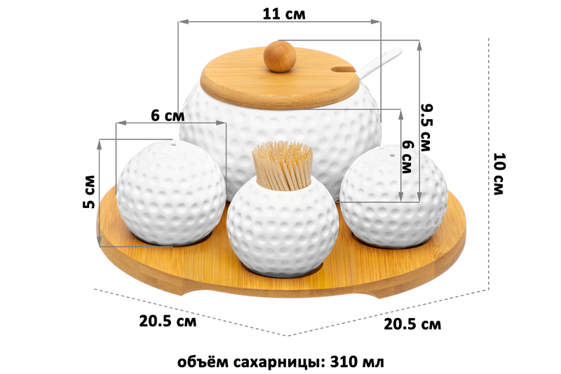 Набор серии "Сфера" состоит из сахарницы на 310 мл с фарфоровой ложкой, вазочки под зубочистки, солонки и перечницы на деревянной подставке. Размер комплекта 20,5х20,5х10 см. Баночки выполнены из высококачественного фарфора и натурального бамбука. Предметы украшены рельефными узорами, что добавит изысканности вашему столу. Емкости для специй снизу имеют отверстия для наполнения, которые закрываются пластиковыми пробками. Уникальный набор посуды станет прекрасным дополнением к вашему столу и подойдет к любому интерьеру кухни, столовой или гостиной. Используйте набор для хранения сахара, соли, перца, любых специй и приправ. Каждая баночка будет выполнять свою функцию и сделает прием пищи удобным. Сахарница подойдет не только для хранения сахара, вы можете использовать ее для меда, варенья, орешков или любых сыпучих продуктов. Фарфоровые детали набора можно мыть в посудомоечной машине. Бамбуковые детали нельзя замачивать. Набор поставляется в яркой картонной упаковке. Баночки станут чудесным подарком для близких и друзей. Подарите посуду маме, бабушке, подруге, сестре, или украсьте свою кухню стильным и функциональным аксессуаром. Набор посуды серии "Сфера" станет украшением вашей кухни и поможет создать на ней уют.