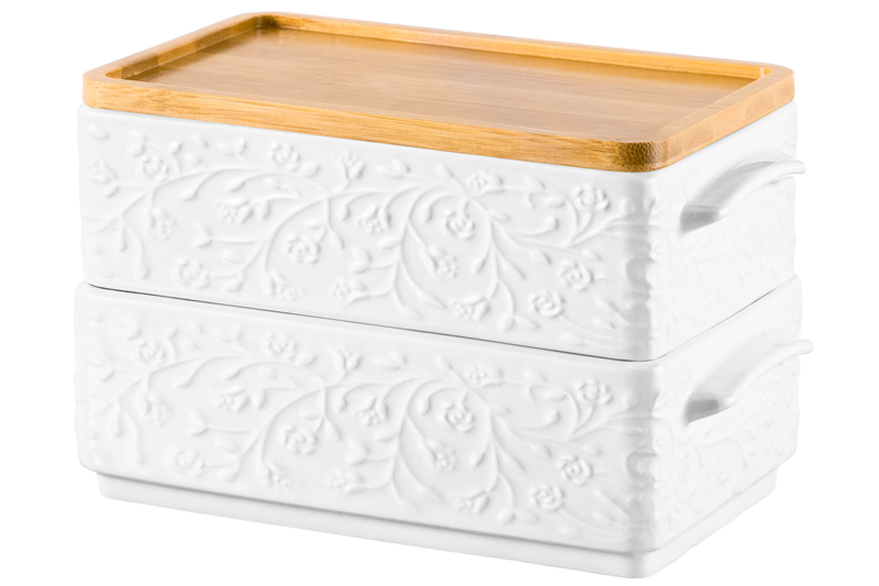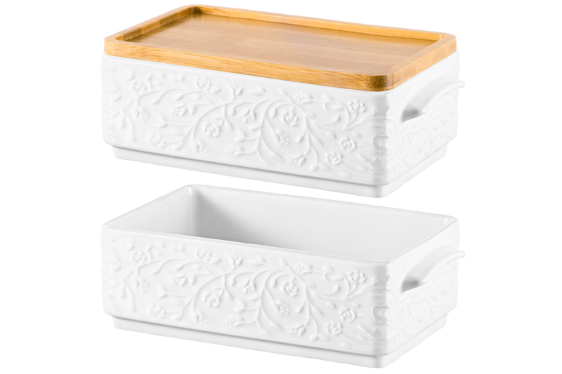 Набор 2 блюд для холодца из серии «Веточки-цветочки» от Elan Gallery предназначен для приготовления и эстетичной подачи ваших любимых блюд. Размер каждого изделия – 20,5х11,5х6 см, объём – 800 мл, внутренний размер – 17х10,5 см. Выполнены из высококачественного фарфора. Он не впитывает цвет продуктов и легко отмывается, благодаря чему надолго сохраняет свою белизну. Поверхность изделий украшают рельефные узоры в виде лиственных веточек с аккуратными цветочными бутончиками. Крышка выполнена из натурального бамбука. Вместительные контейнеры подойдут для сельди под шубой, салатов и плова, и помогут порадовать себя или гостей за праздничным столом. Используйте их в качестве салатников или глубоких сервировочных блюд для эстетичной подачи закусок из мяса и рыбы. Такая посуда удобна для приготовления заливного или желе, а также бисквита или творожной запеканки. Заполните каждое блюдо щедрой порцией мороженого, чтобы угостить большую компанию. Компактно храните штабелируемые блюда друг на друге. Лаконичный дизайн впишет их в интерьер любой кухни, гостиной или столовой. Не рекомендуется применять абразивные моющие средства. Без крышки подойдут для использования в посудомоечной машине, микроволновой печи и духовом шкафу при температуре до 230 градусов. Бамбук нельзя замачивать! Поставляются в дизайнерской картонной коробке – благодаря ей вам не потребуется дополнительная подарочная упаковка. Фарфоровая сервировочная посуда будет оригинальным подарком для хозяйки, ценящей не только практичность, но и привлекательность. Серия «Веточки-цветочки» от бренда Элан Галерея станет украшением любого кухонного инвентаря и позволит собрать красивый сервиз в едином стиле!