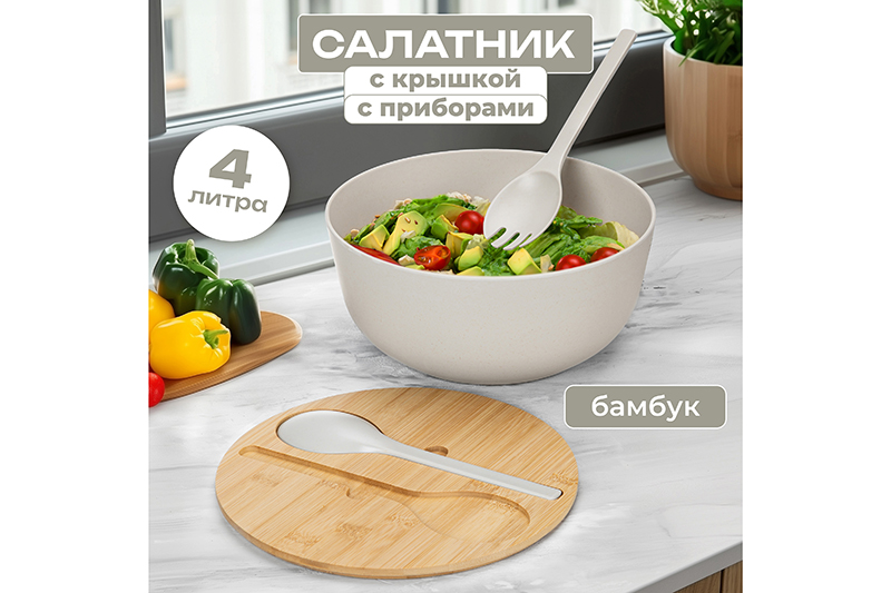 Салатник от бренда Elan Gallery светло-серого цвета выполнен из прессованного бамбука. Размер 25х25х11,7 см, объём 4 литра. Размер без крышки 25х25х11,2 см, диаметр дна 15 см. Салатная миска имеет бамбуковую крышку с фигурными отсеками для хранения ложки и вилки. Вилочка и ложечка для размешивания идут в комплекте к блюду, изготовлены из бамбукового волокна. Большую ёмкость можно использовать как домашнюю утварь на кухне, а также как походную. Посуда из прессованного бамбука изготовлена по особой технологии, поэтому имеет лёгкий вес и высокую прочность. Бамбуковая чаша с крышечкой – это стильно и экологично! Набор из глубокой тарелки и столовых приборов для смешивания не впитывает запах продуктов и не выделяет вредных веществ. Положите в тазик фрукты или сделайте салатик, чтобы перекусить на природе. Благодаря столовым приборам вы можете наслаждаться свежим салатом даже в походе. Большой объём контейнера и приборы в комплекте позволят удобно смешивать ингредиенты. Можно использовать для подачи и сервировки овощей и фруктов в роли фруктовой вазы. Не рекомендуется применять абразивные моющие средства. Не использовать для хранения жидкостей. Не нагревать и беречь от открытого огня. Нельзя использовать в посудомоечной машине и микроволновой печи. Сервировочная миска легко моется вручную. Бамбук нельзя замачивать. Станет полезным подарком на любой праздник, потому что всегда пригодится дома, на даче или пикнике. В коллекции бренда Элан Галерея представлено много стильных товаров для дома, в том числе функционального кухонного инвентаря. Выберите красивые кухонные аксессуары на свой вкус.