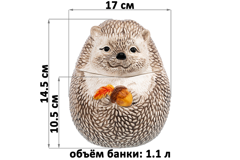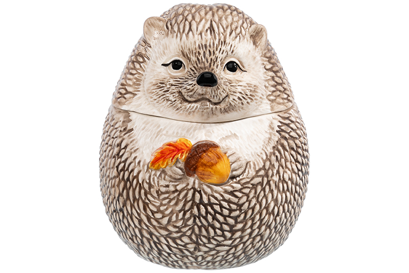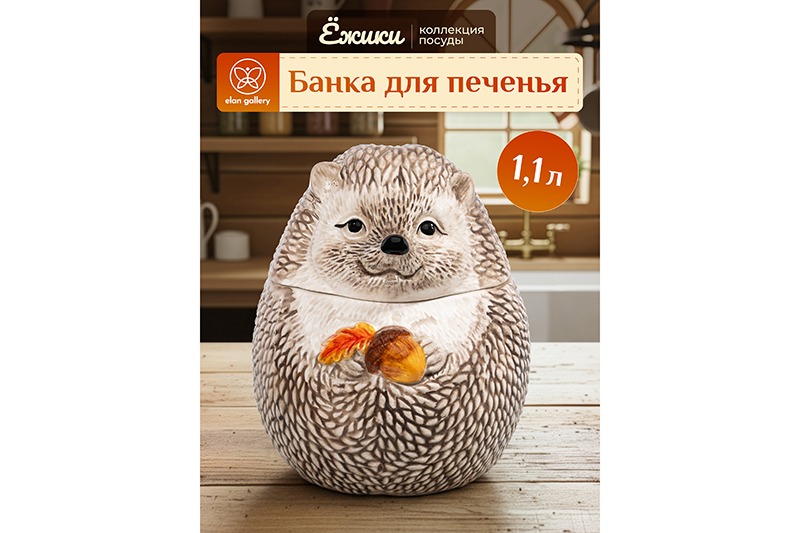 Банка для печенья из серии «Ёжики» от Elan Gallery поможет организовать хранение продуктов на вашей кухне. Размер изделия – 14,5х14,5х17 см, объём – 1,1 литра, размер дна – 9,5 см. Выполнена из керамики в виде большого реалистичного ёжика. В лапках он держит красочный жёлудь. Красивый контейнер подойдёт для ваших любимых угощений и сладостей: конфет, печенья, леденцов и зефира. Сложите в него орехи, ягоды и сухофрукты. Используйте для хранения различных сыпучих продуктов: чая и кофе, сахара и соли, приправ и специй. Он станет незаменимым элементом вашего кухонного инвентаря и пригодится при подаче самых разнообразных блюд. Прекрасно дополнит сервировку праздничного стола. Используйте большого ёжика в качестве декоративной фигурки, разместите на полке или тумбочке. Не рекомендуется применять абразивные моющие средства. Не подходит для использования в посудомоечной машине и микроволновой печи. Поставляется в яркой картонной коробке – благодаря ей вам не потребуется дополнительная подарочная упаковка. Коллекция «Ёжики» от бренда Элан Галерея – это посуда, где каждая деталь создана с теплом и раскрашена оттенками осени!