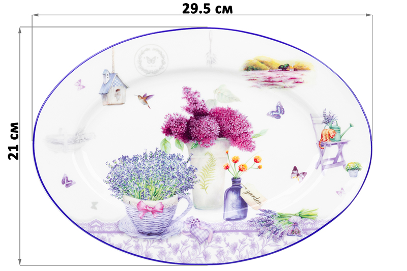 Овальное блюдо Elan Gallery "Лаванда" размером 29,5х21х2,5 см выполнено из фарфора new bone china. New bone china сочетает в себе изящность и высокую прочность. От других видов костяного фарфора материал отличается большей экологичностью в производстве. Серия "Лаванда" украшена нежным принтом на тему Прованса – французской провинции, которая славится своими лавандовыми полями и красивыми пейзажами. Изображение пышных букетов лаванды и гортензии позволит окунуться в атмосферу тепла, гармонии и южного солнца, не покидая вашей кухни или столовой! Тарелочка подойдет для подачи рыбных, мясных блюд и закусок. Можно использовать для сервировки нарезки, овощей или фруктов для угощения большого количества гостей. Эргономичная форма тарелки позволит использовать её как поднос. Удобно разместить на сервировочном блюде кусочки торта, пирога и другие сладости. Подойдёт для эстетичной подачи суши, роллов и бутербродов. Фарфоровая посуда отличается от керамической повышенной плотностью. Фарфор не впитывает цвет продуктов и не деформируется от влаги, чему может быть подвержена керамика. Избегать резких перепадов температур и беречь от механических повреждений. Не рекомендуется применять абразивные моющие средства. Можно использовать в микроволновой печи и мыть в посудомоечной машине. Поставляется в красочной картонной коробке. Станет отличным подарком на любой праздник для тех, кто ценит стильную сервировку. Благодаря красочной коробочке не понадобится подарочная упаковка. Серия "Лаванда" позволит собрать сервиз в едином стиле и станет украшением вашего дома.