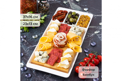 Набор для сервировки сыра из серии «Айсберг» предназначен для эстетичной подачи закусок к столу. Размер изделия – 31,5х24,5х4 см. Размер доски – 21х21х1 см. Размер каждого соусника – 7х7х3 см, объём – 50 мл. Выполнены из высококачественного белого фарфора, разделочная доска в комплекте выполнена из бамбука. Фарфор не впитывает цвет продуктов и легко отмывается, благодаря чему надолго сохранит свою белизну. Используйте соусники для подачи оливок, маслин, виноградин, фруктовых долек или нарезанных овощей. Заполните кетчупом, майонезом или жидкими соусами. Разделочная доска позволит нарезать продукты без дополнительных кухонных принадлежностей. Сервировочное блюдо поможет вам создать идеальную атмосферу для приёма гостей или романтичного ужина дома. Возьмите его на дачу или пикник, чтобы красиво подавать любимые угощения. Используйте деревянную подставку для сервировки отдельно от блюда, чтобы подать ещё больше лакомств! Не рекомендуется применять абразивные моющие средства. Без бамбуковой подставки подходит для использования в микроволновой печи и посудомоечной машине. Бамбук нельзя замачивать! Фарфоровая сервировочная посуда с элементами из дерева станет оригинальным подарком для хозяйки, ценящей не только практичность, но и привлекательность. Серия «Айсберг» станет украшением любого кухонного инвентаря и позволит собрать красивый сервиз в едином стиле!