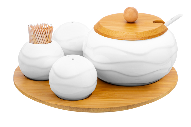 Набор серии "Айсберг волны" состоит из сахарницы на 310 мл с фарфоровой ложкой, вазочки под зубочистки, солонки и перечницы на деревянной подставке. Размер комплекта 20,5х20,5х10 см. Баночки выполнены из высококачественного фарфора и натурального бамбука. Предметы украшены рельефными узорами, что добавит изысканности вашему столу. Емкости для специй снизу имеют отверстия для наполнения, которые закрываются пластиковыми пробками. Уникальный набор посуды станет прекрасным дополнением к вашему столу и подойдет к любому интерьеру кухни, столовой или гостиной. Используйте набор для хранения сахара, соли, перца, любых специй и приправ. Каждая баночка будет выполнять свою функцию и сделает прием пищи удобным. Сахарница подойдет не только для хранения сахара, вы можете использовать ее для меда, варенья, орешков или любых сыпучих продуктов. Фарфоровые детали набора можно мыть в посудомоечной машине. Бамбуковые детали нельзя замачивать. Набор поставляется в яркой картонной упаковке. Баночки станут чудесным подарком для близких и друзей. Подарите посуду маме, бабушке, подруге, сестре, или украсьте свою кухню стильным и функциональным аксессуаром. Набор посуды серии "Айсберг волны" станет украшением вашей кухни и поможет создать на ней уют.