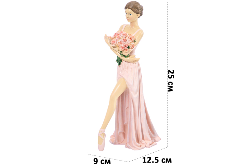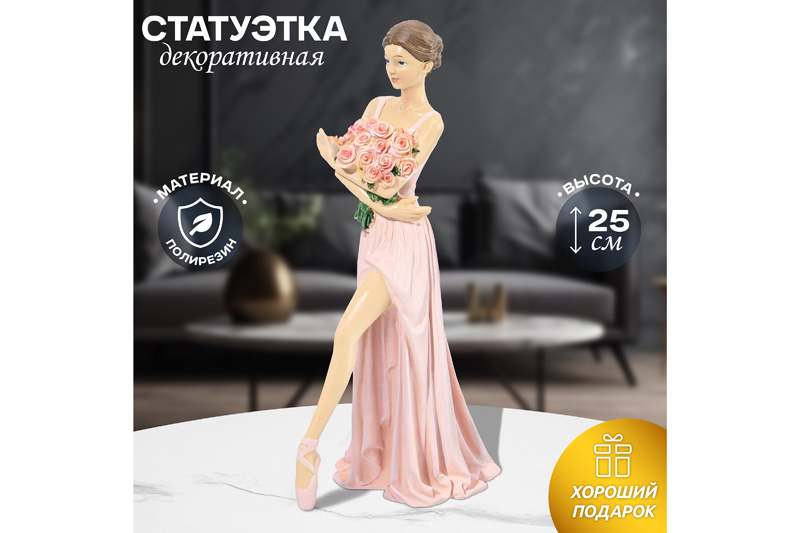 Декоративная статуэтка «Балерина с цветами в розовом» от Elan Gallery преобразит любое помещение. Размер изделия – 9х12,5х25 см. Выполнена из полирезина – современного материала, который славится своей лёгкостью, устойчивостью к влаге и солнечным лучам. Он не выделяет вредных веществ и не имеет запаха. Полирезин легко поддаётся обработке, поэтому изделия из него отличаются своей реалистичностью и проработанной детализацией. Элегантная балерина одета в розовое платье и грациозно тянет ногу в пуанте, а к груди прижимает пышный букет роз. Цветы покрыты блёстками, ярко играющими на свету. Она мягко улыбается, выражая благожелательность и приветливость. Настольная фигурка дополнит и освежит антураж любой комнаты. Разместите её на полке, комоде или письменном столе, создайте композицию с другими статуэтками и декоративными элементами. Эта статуэтка гармонично впишется в интерьер спальни, гостиной, кабинета или творческой мастерской, добавив пространству лёгкости и романтичность. Не рекомендуется применять абразивные моющие средства. В коллекции бренда Элан Галерея вы найдёте множество как ярких, так и нежных декоративных украшений – каждый обязательно подберёт сувенир на свой вкус. Они станут чудесным подарком для родных, близких и коллег. Наполните пространство вокруг себя красотой и радостью!