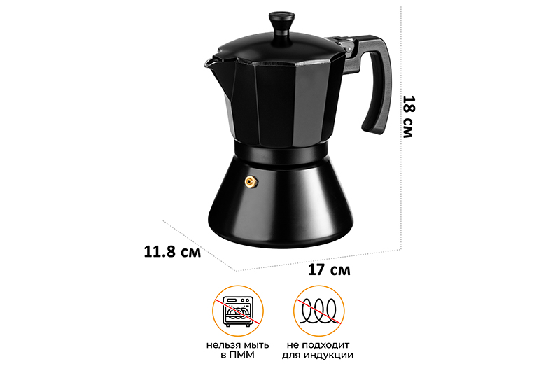 Гейзерная кофеварка – настоящая находка для любителей кофе! Размер 17х11,8х18 см, объём ёмкости 300 мл. Это удобное приспособление для приготовления ароматного и бодрящего напитка. В отличие от кофемашины не займёт много места на кухне и позволит быстро приготовить горячий напиток. Этот инвентарь подходит для всех видов плит (кроме индукции) и рассчитан на приготовление 6 стандартных чашек эспрессо. Благодаря закрытой крышечке предотвратит попадание брызг на плиту при варке, поэтому при использовании удобнее открытой турки. Кофеварка элегантного чёрного цвета выполнена из алюминия, имеет ручку из качественного пластика. Впервые созданная в Италии под названием Moka Express в 1933 году, гейзерная кофеварка приобрела популярность по всему миру. Принцип приготовления кофе в такой кухонной утвари прост: под давлением пара вода поднимается из нижнего резервуара в верхний через фильтр с молотым кофе. Кофейная гуща остается в фильтре-резервуаре, поэтому ничто не мешает наслаждаться любимым напитком. Как приготовить кофе: наполните нижний резервуар водой до предохранительного клапана. Уровень воды не должен превышать предохранительный клапан! Насыпьте молотый кофе в среднюю воронку-фильтр. Закройте кофеварку и поставьте на плиту. Доведите до кипения. Инструкция: после использования промыть водой. Не применять моющие средства. Не мыть в посудомоечной машине. Используйте ручку, чтобы не обжечься об нагретую алюминиевую поверхность. Не подходит для индукции. Благодаря стильному минималистичному дизайну в таком кофейнике можно эстетично подать готовый кофе на стол. Станет оригинальным подарком как для мужчины, так и для женщины. Поставляется в стильной картонной коробке. Благодаря красочной коробочке вам не понадобится дополнительная подарочная упаковка. Приготовьте напиток в лучших традициях итальянской кофейни прямо у себя дома благодаря посуде от Elan Gallery!