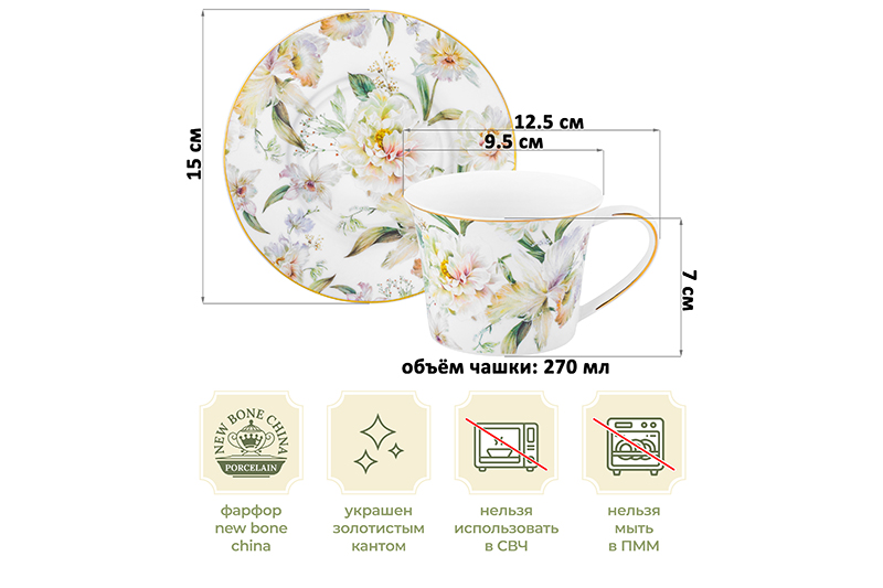 Набор 2 чайных пар из серии «Корнелия» от Elan Gallery предназначен для эстетичной сервировки вашего стола. Размер каждой ёмкости – 12,5х9,5х7 см, объём – 270 мл. Размер каждого блюдца – 15х15х2 см. Изготовлены из фарфора нового поколения new bone china, сочетающего в себе изящность и высокую прочность. За счёт гладкости изделия легко отмываются, поэтому сохраняют привлекательный внешний вид и практичны в использовании. Плотная структура материала позволяет посуде дольше сохранять температуру блюд и напитков. От других видов костяного фарфора new bone china отличается большей экологичностью в производстве. Поверхность изделий овивают изображения обворожительных белых пионов. Они выполнены в манере, вдохновлённой акварельным рисунком. Тонкая золотистая окантовка служит деликатным акцентом и подчёркивает их изысканность. Кофейные кружечки помогут провести множество приятных завтраков с капучино и латте, а также уютные чайные вечера с конфетами, вафлями, другими десертами и сладостями. Подойдут ценителям чая и кофе, которые любят пить из красивой и необычной посуды. Согрейтесь зимой любимым напитком: какао с маршмэллоу, ягодным чаем или горячим шоколадом. Летом освежитесь домашним лимонадом или морсом. Используйте сервировочные блюдца как подставки для чашек или заполните пирожными, кусочками торта и домашнего пирога. Подойдут для закусок: сырной нарезки, сырокопчёной колбасы или свежих овощей и зелени. Декоративный комплект позволит организовать запоминающееся чаепитие в большой компании. Не рекомендуется применять абразивные моющие средства. Не подходят для использования в посудомоечной машине и микроволновой печи. Поставляются в подарочной упаковке. Фарфоровая сервировочная посуда будет оригинальным подарком для хозяйки, ценящей не только практичность, но и привлекательность. Серия «Корнелия» от бренда Элан Галерея добавит вашему кухонному инвентарю лёгкости и элегантности, преобразив любую сервировку!
