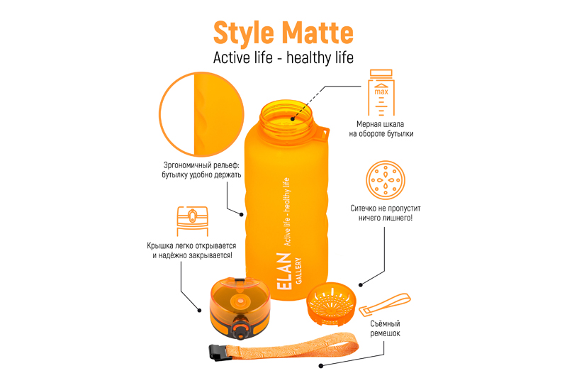 Бутылка для воды «Style Matte» от Elan Gallery – это практичное и стильное решение для ценителей активного образа жизни. Размер ёмкости – 10х10х28,5 см. Высота до крышки – 24 см. Объём – 1,5 литра. Изделие выполнено из тритана – прочного, безопасного материала, не содержащего бисфенол А. Этот пластик не впитывает запахи и не влияет на вкус напитков. Бутылочка подходит как для холодной, так и для горячей жидкости. Освежитесь любимыми летними напитками в жару или согрейтесь ароматным чаем зимой! Матовое покрытие и углубления для пальцев обеспечивают комфортное использование на прогулке, в офисе и на тренировке в зале. Надёжная крышка с герметичным клапаном препятствует проливанию, а встроенное ситечко позволит заваривать напитки с травами и фруктами. С удобным ремешком бутылку можно закрепить на рюкзаке или запястье – это позволяет брать её в путешествия, поездку на велосипеде или автомобиле. Многоразовая дорожная бутылка подходит как для туризма, так и для пикника на природе. Удобная форма делает её не только туристическим, но и спортивным инвентарём. Большая пластиковая ёмкость для питья – прекрасный вариант для занятий фитнесом, йогой или бегом в спортзале или на свежем воздухе. Она также дополнит занятия велоспортом в качестве велосипедного аксессуара. Это надёжный помощник спортсменам во время игры в футбол или волейбол, занятий гимнастикой и танцами. Подходит как для взрослых, так и для школьников – её можно взять в школу и на занятия физкультурой. Благодаря универсальному дизайну и оранжевому цвету она подойдёт как девочкам, так и мальчикам в качестве школьного аксессуара. Функциональная бутылка в дизайнерской картонной упаковке – это готовый подарок для женщин и мужчин. Не подходит для микроволновой печи, посудомоечной машины и стерилизатора. В коллекции бренда Элан Галерея представлена разнообразная посуда и товары для дома на любой вкус. Спортивные аксессуары из серии «Style Matte» помогут следить за водным балансом, где бы вы ни находились!