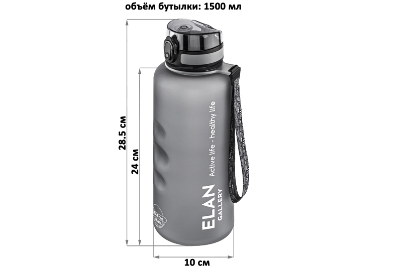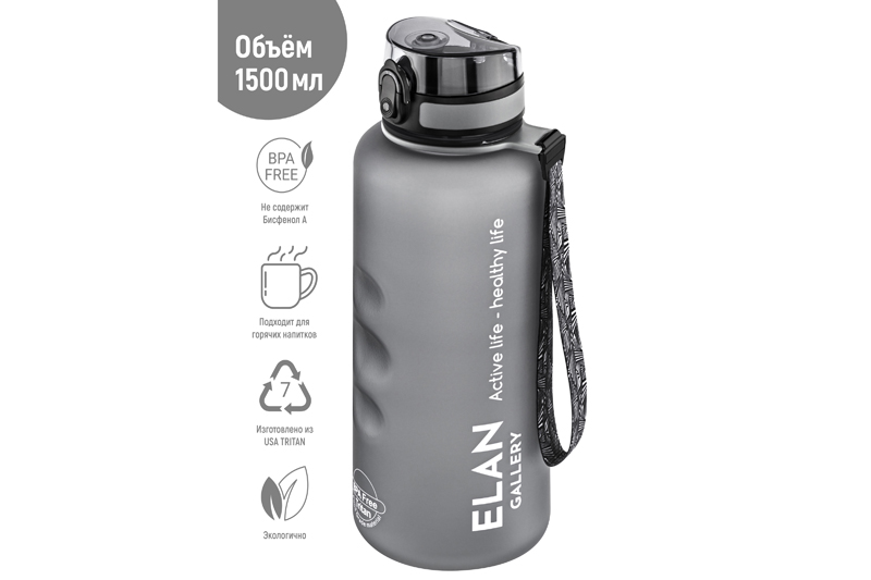 Бутылка для воды «Style Matte» от Elan Gallery – это практичное и стильное решение для ценителей активного образа жизни. Размер ёмкости – 10х10х28,5 см. Высота до крышки – 24 см. Объём – 1,5 литра. Изделие выполнено из тритана – прочного, безопасного материала, не содержащего бисфенол А. Этот пластик не впитывает запахи и не влияет на вкус напитков. Бутылочка подходит как для холодной, так и для горячей жидкости. Освежитесь любимыми летними напитками в жару или согрейтесь ароматным чаем зимой! Матовое покрытие и углубления для пальцев обеспечивают комфортное использование на прогулке, в офисе и на тренировке в зале. Надёжная крышка с герметичным клапаном препятствует проливанию, а встроенное ситечко позволит заваривать напитки с травами и фруктами. С удобным ремешком бутылку можно закрепить на рюкзаке или запястье – это позволяет брать её в путешествия, поездку на велосипеде или автомобиле. Многоразовая дорожная бутылка подходит как для туризма, так и для пикника на природе. Удобная форма делает её не только туристическим, но и спортивным инвентарём. Большая пластиковая ёмкость для питья – прекрасный вариант для занятий фитнесом, йогой или бегом в спортзале или на свежем воздухе. Она также дополнит занятия велоспортом в качестве велосипедного аксессуара. Это надёжный помощник спортсменам во время игры в футбол или волейбол, занятий гимнастикой и танцами. Подходит как для взрослых, так и для школьников – её можно взять в школу и на занятия физкультурой. Благодаря универсальному дизайну и серому цвету она подойдёт как девочкам, так и мальчикам в качестве школьного аксессуара. Функциональная бутылка в дизайнерской картонной упаковке – это готовый подарок для женщин и мужчин. Не подходит для микроволновой печи, посудомоечной машины и стерилизатора. В коллекции бренда Элан Галерея представлена разнообразная посуда и товары для дома на любой вкус. Спортивные аксессуары из серии «Style Matte» помогут следить за водным балансом, где бы вы ни находились!
