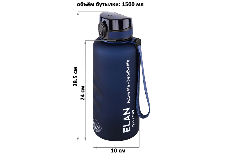 Бутылка для воды «Style Matte» от Elan Gallery – это практичное и стильное решение для ценителей активного образа жизни. Размер ёмкости – 10х10х28,5 см. Высота до крышки – 24 см. Объём – 1,5 литра. Изделие выполнено из тритана – прочного, безопасного материала, не содержащего бисфенол А. Этот пластик не впитывает запахи и не влияет на вкус напитков. Бутылочка подходит как для холодной, так и для горячей жидкости. Освежитесь любимыми летними напитками в жару или согрейтесь ароматным чаем зимой! Матовое покрытие и углубления для пальцев обеспечивают комфортное использование на прогулке, в офисе и на тренировке в зале. Надёжная крышка с герметичным клапаном препятствует проливанию, а встроенное ситечко позволит заваривать напитки с травами и фруктами. С удобным ремешком бутылку можно закрепить на рюкзаке или запястье – это позволяет брать её в путешествия, поездку на велосипеде или автомобиле. Многоразовая дорожная бутылка подходит как для туризма, так и для пикника на природе. Удобная форма делает её не только туристическим, но и спортивным инвентарём. Большая пластиковая ёмкость для питья – прекрасный вариант для занятий фитнесом, йогой или бегом в спортзале или на свежем воздухе. Она также дополнит занятия велоспортом в качестве велосипедного аксессуара. Это надёжный помощник спортсменам во время игры в футбол или волейбол, занятий гимнастикой и танцами. Подходит как для взрослых, так и для школьников – её можно взять в школу и на занятия физкультурой. Благодаря универсальному дизайну и тёмно-синему цвету она подойдёт как девочкам, так и мальчикам в качестве школьного аксессуара. Функциональная бутылка в дизайнерской картонной упаковке – это готовый подарок для женщин и мужчин. Не подходит для микроволновой печи, посудомоечной машины и стерилизатора. В коллекции бренда Элан Галерея представлена разнообразная посуда и товары для дома на любой вкус. Спортивные аксессуары из серии «Style Matte» помогут следить за водным балансом, где бы вы ни находились!