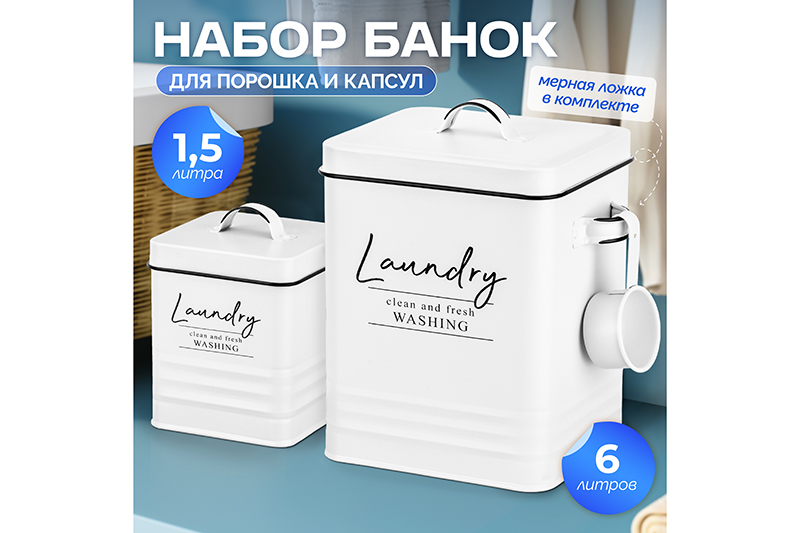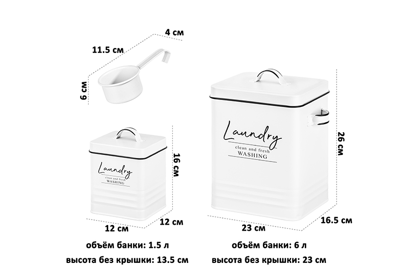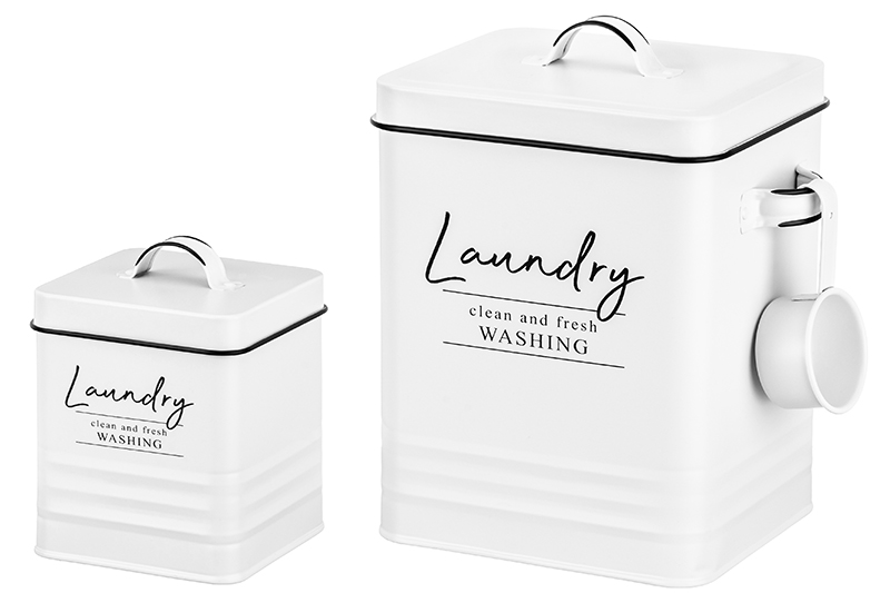 Набор 2 контейнеров для порошка и капсул от Elan Gallery – это стильное решение для хранения моющих средств в ванной. В набор входят металлические ёмкости размерами: 23х16,5х26 см на 6 литров (высота без крышки 23 см) с ложкой в комплекте, 12х12х16 см на 1,5 литра (высота без крышки 13,5 см). Размер ложки 11,5х6х4 см. Белые баночки прямоугольной формы украшены надписями «Laundry» («Прачечная») и «Clean and fresh washing» («Чистая и свежая стирка»). Ящички выполнены из металла с пудровым покрытием, что гарантирует долговечность использования. Крышки ёмкостей украшены чёрным окаймлением, имеют ручки в форме петелек. Большая металлическая коробка удобна для хранения сыпучих продуктов. По бокам имеет две ручки для комфортной переноски. В комплекте поставляется ложечка для порошка, которую удобно хранить, подвесив на боковую ручку. Квадратная коробочка поменьше подойдёт для хранения капсул для стирки белья, таблеток для очистки машинки и других мелочей. Благодаря стильному дизайну органайзеры можно хранить на открытой полке или столе, они украсят интерьер ванной комнаты. Поставьте бокс возле стиральной машины, чтобы очищающие средства во время стирки были под рукой. Декоративный комплект выглядит красивее картонных коробок с бытовой химией, доступ к чистящим средствам станет простым и быстрым. На кухне банку можно использовать под сухой корм для животных: кошек, собак и других питомцев. Мерный черпак позволит рассчитывать порцию и удобно насыпать её в мисочку. Хозяйственный инвентарь послужит вместительными ящиками для пищевой соды и соли. Не рекомендуется применять абразивные моющие средства. Нельзя использовать в посудомоечной машине и микроволновой печи. Поставляется в красочной картонной коробке. Благодаря яркой коробочке не понадобится подарочная упаковка, если вы решите сделать подарок на праздник своим близким. В коллекции бренда Элан Галерея представлено много товаров для дома. Здесь вы найдёте всё для организации компактной системы хранения любых вещей.